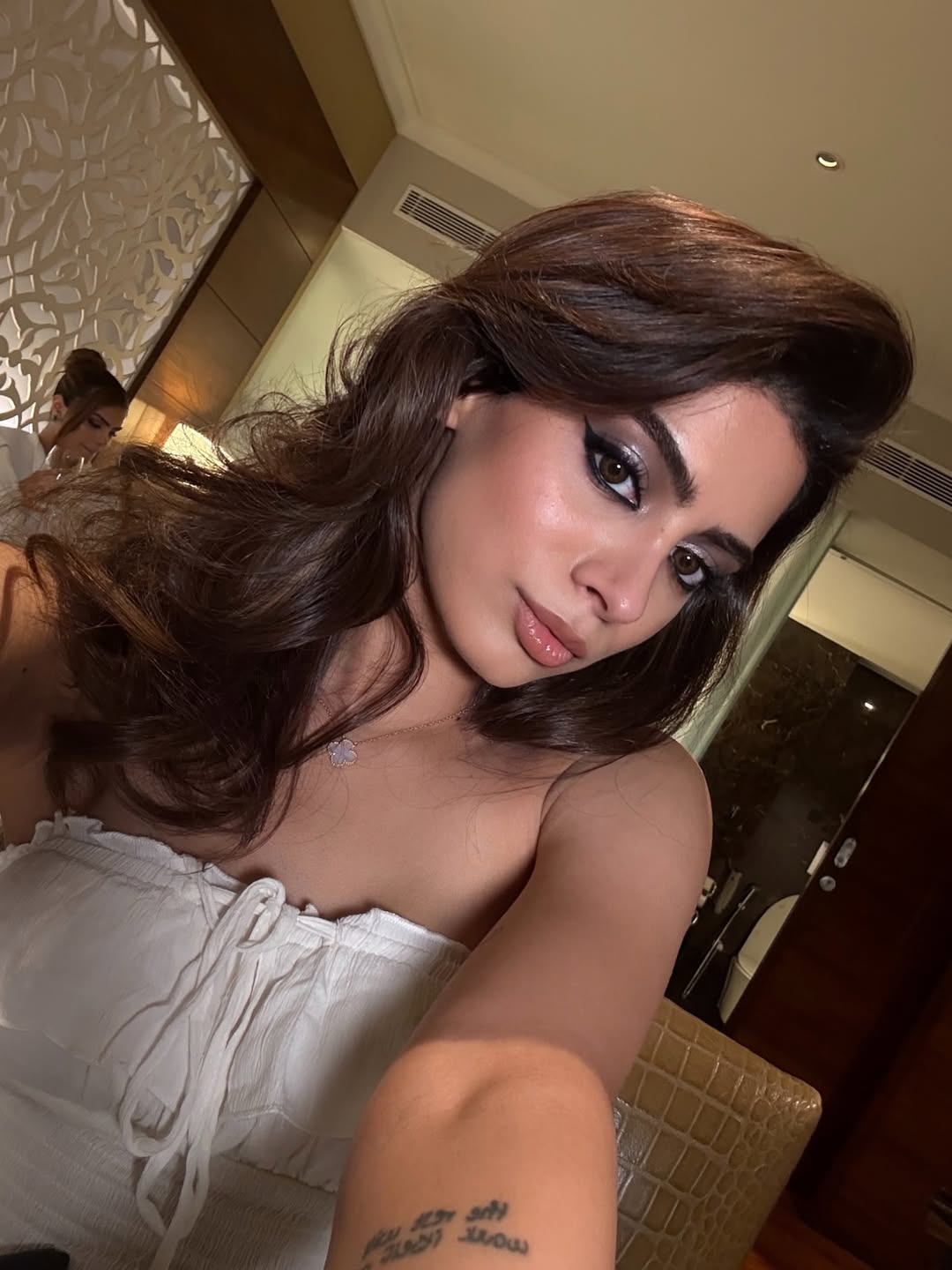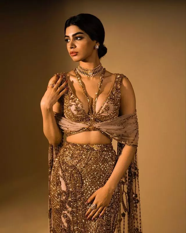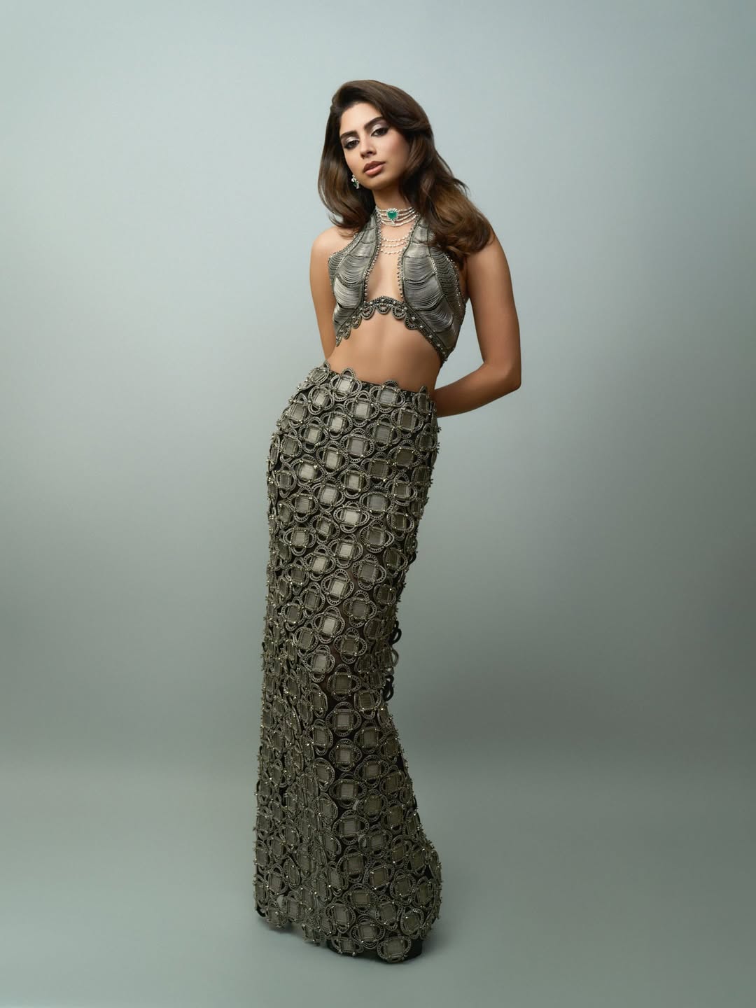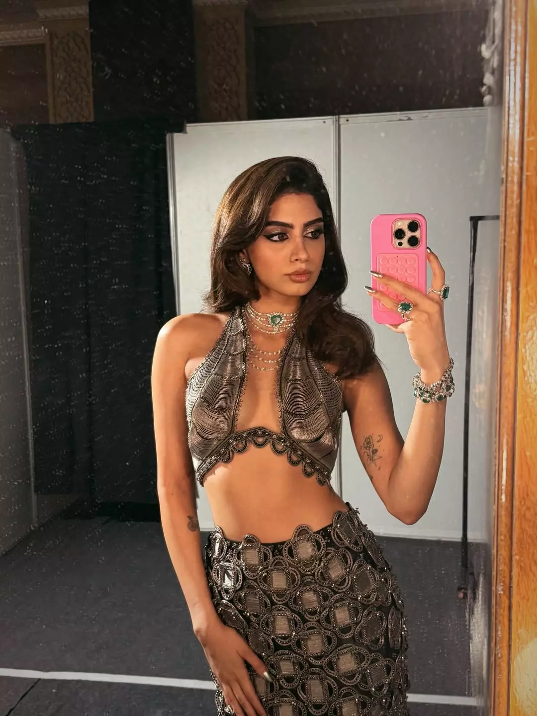 Khushi's dress for the event was nothing short of breathtaking. She wore a metallic grey see-through textured skirt paired with a halter neck blouse that beautifully highlighted her figure. The look was enhanced with diamond and emerald jewelry, a cat eyeliner and smokey eyeshadow.