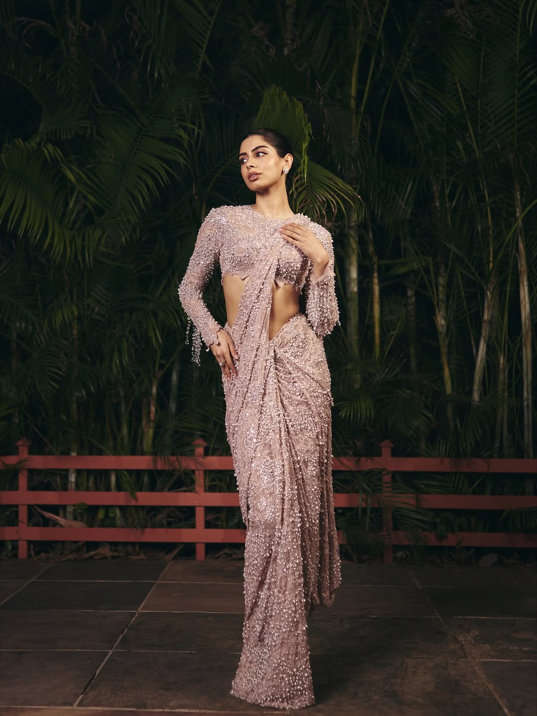 The young actress looked beautiful in a shimmery pastel saree decorated with pearls and delicate embroidery. The elegant dress featured a matching blouse with long sleeves and soft beadwork.