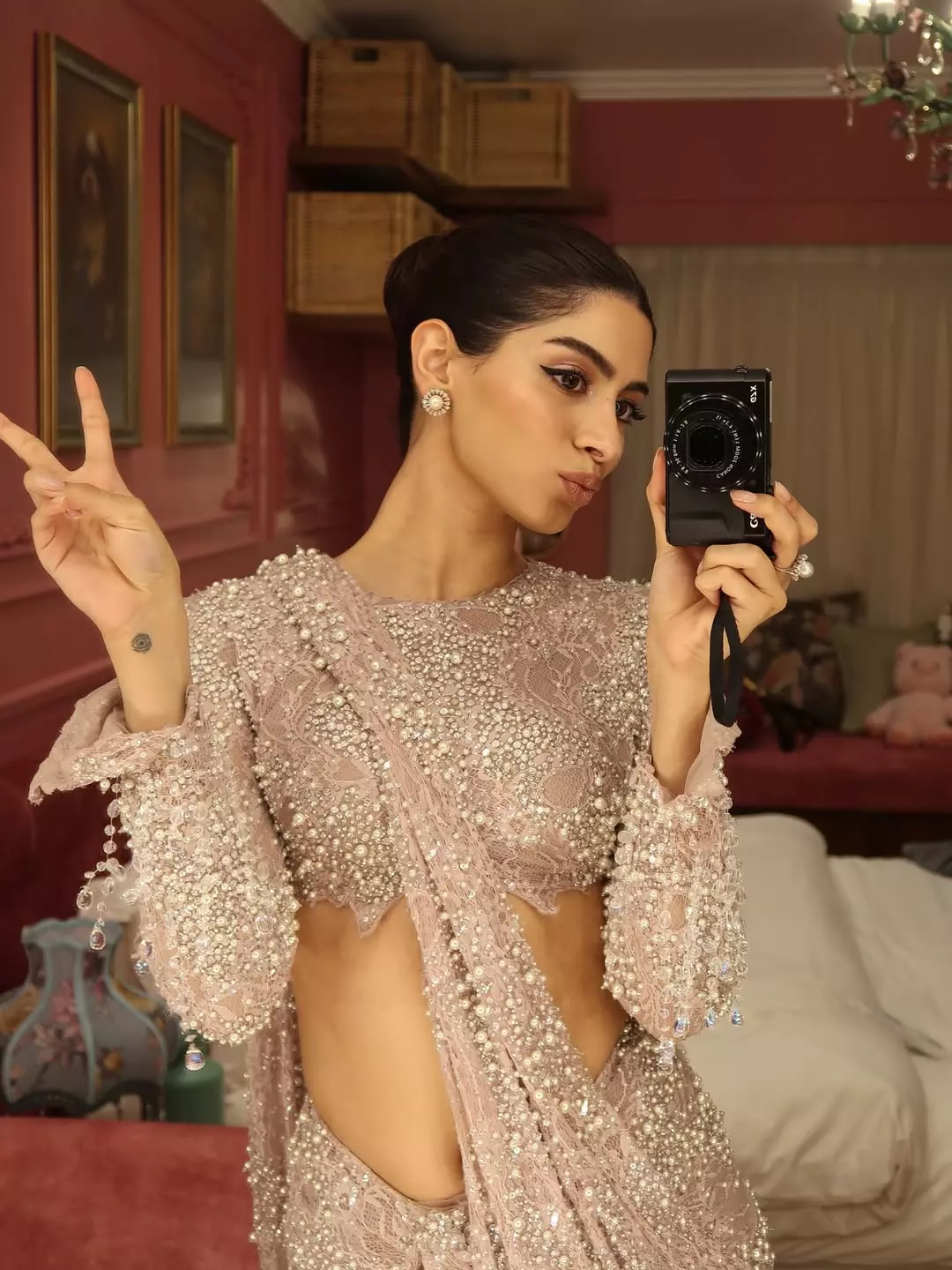 By: Priya Chowdhary Nuthalapti | 13 Oct 2025 3:32 PM ISTKhushi Kapoor’s recent Instagram post has caught everyone’s attention. Khushi Kapoor who is daughter of late actress Sridevi and producer Boney Kapoor, shared a new photo on Instagram with the caption, “First of the season 🥳🤍.” The young actress looked beautiful in a shimmery pastel saree decorated with pearls and delicate embroidery. The elegant dress featured a matching blouse with long sleeves and soft beadwork.