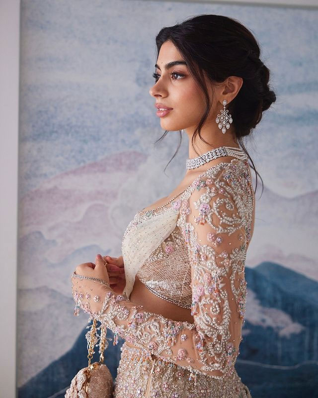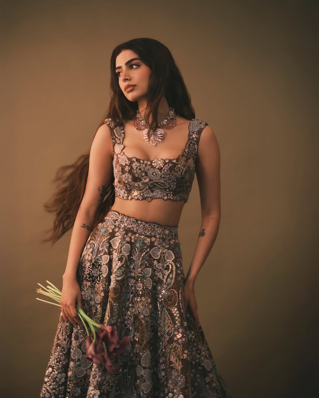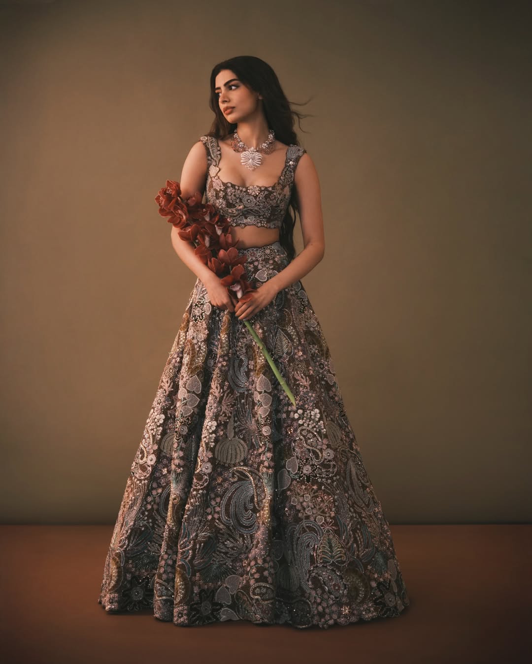 “Loved playing muse to @aisharaoofficial in this gorgeous appliqué mesh lehenga and their custom made multi-sapphire collar necklace for their collection INTER-HANA at @lakmefashionwk. Something special about being dressed by a woman who just gets it! ” Khushi wrote, expressing her joy at collaborating with the designer.
