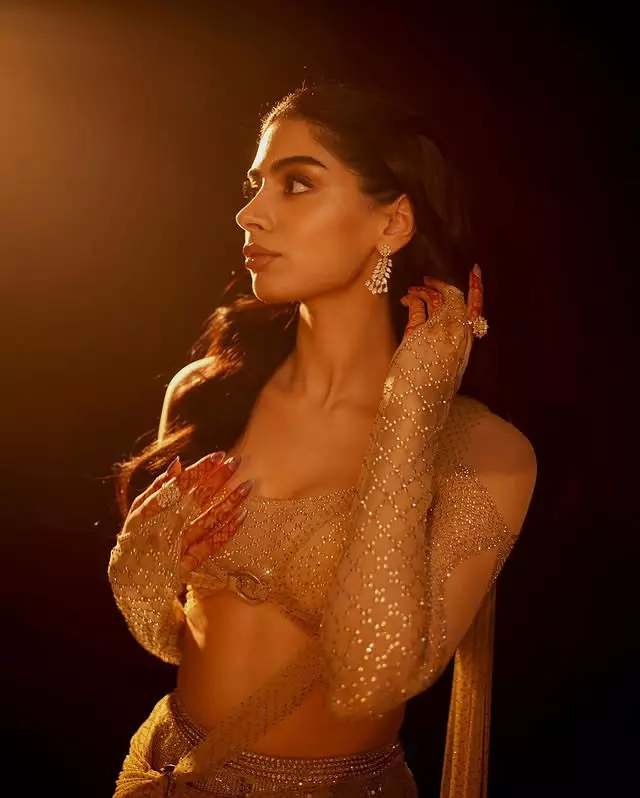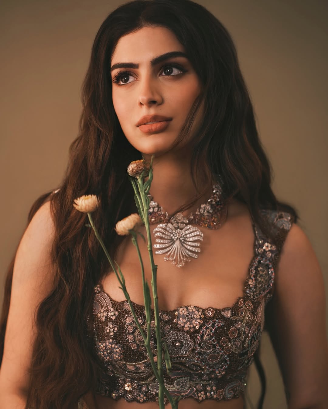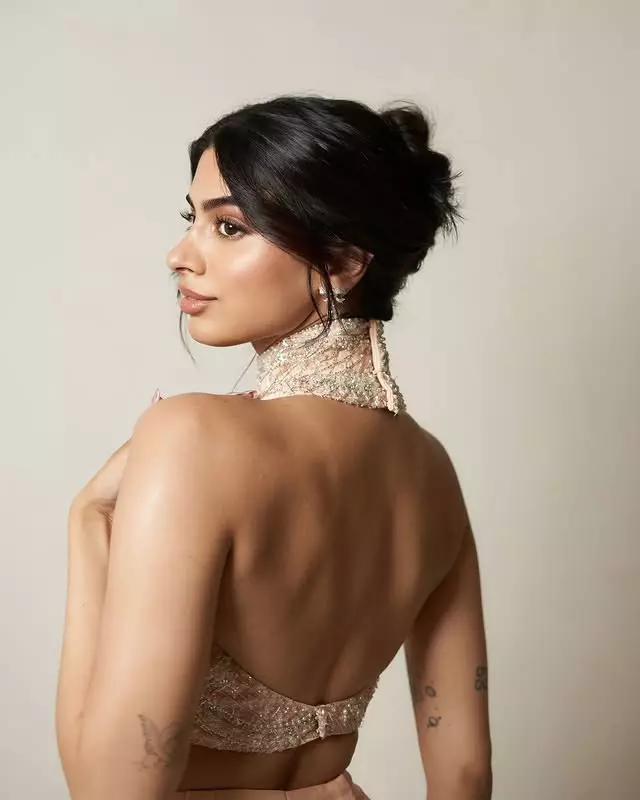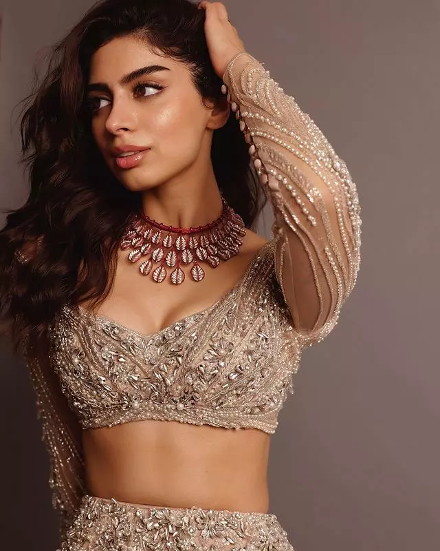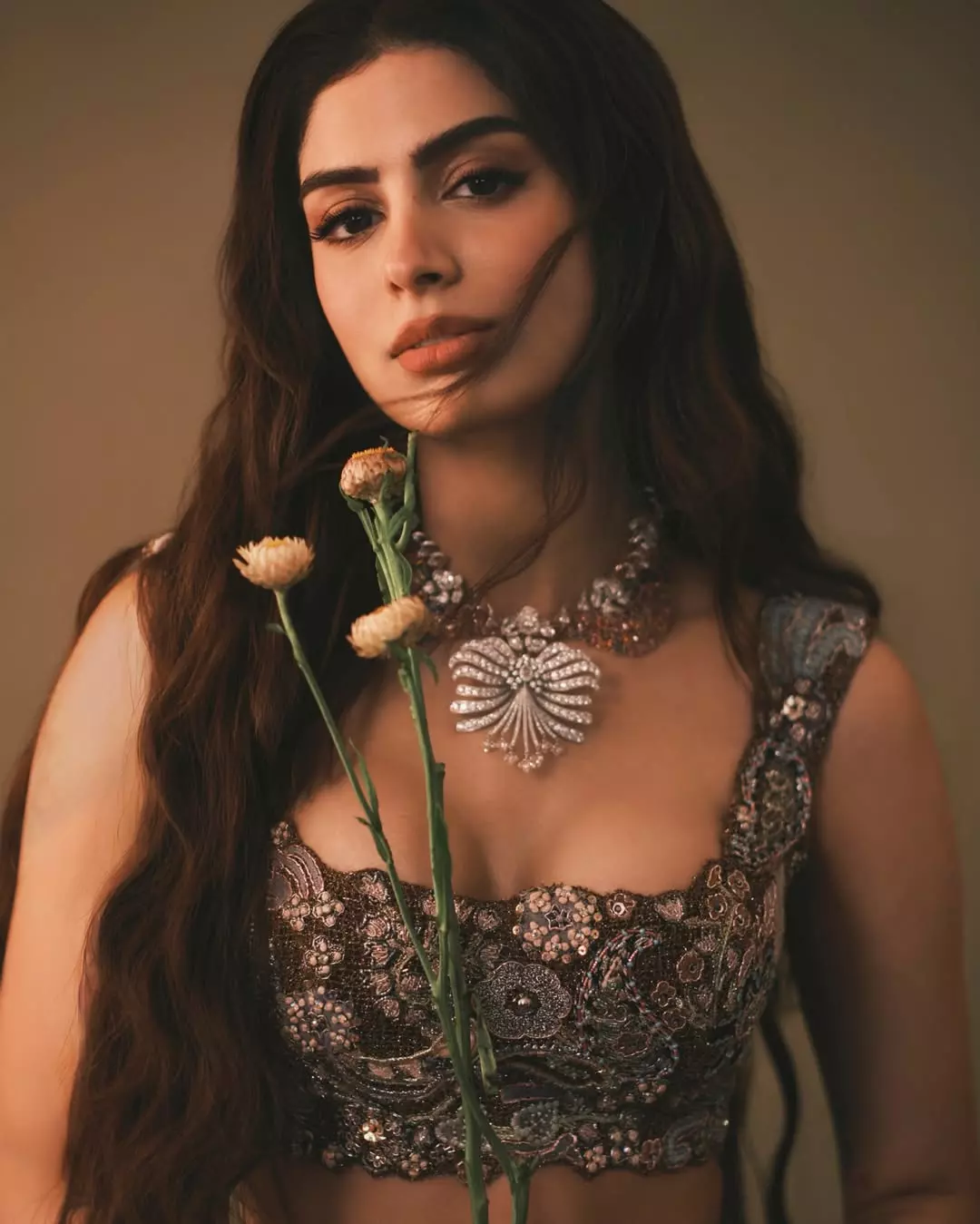 “Loved playing muse to @aisharaoofficial in this gorgeous appliqué mesh lehenga and their custom made multi-sapphire collar necklace for their collection INTER-HANA at @lakmefashionwk. Something special about being dressed by a woman who just gets it! ” Khushi wrote, expressing her joy at collaborating with the designer.