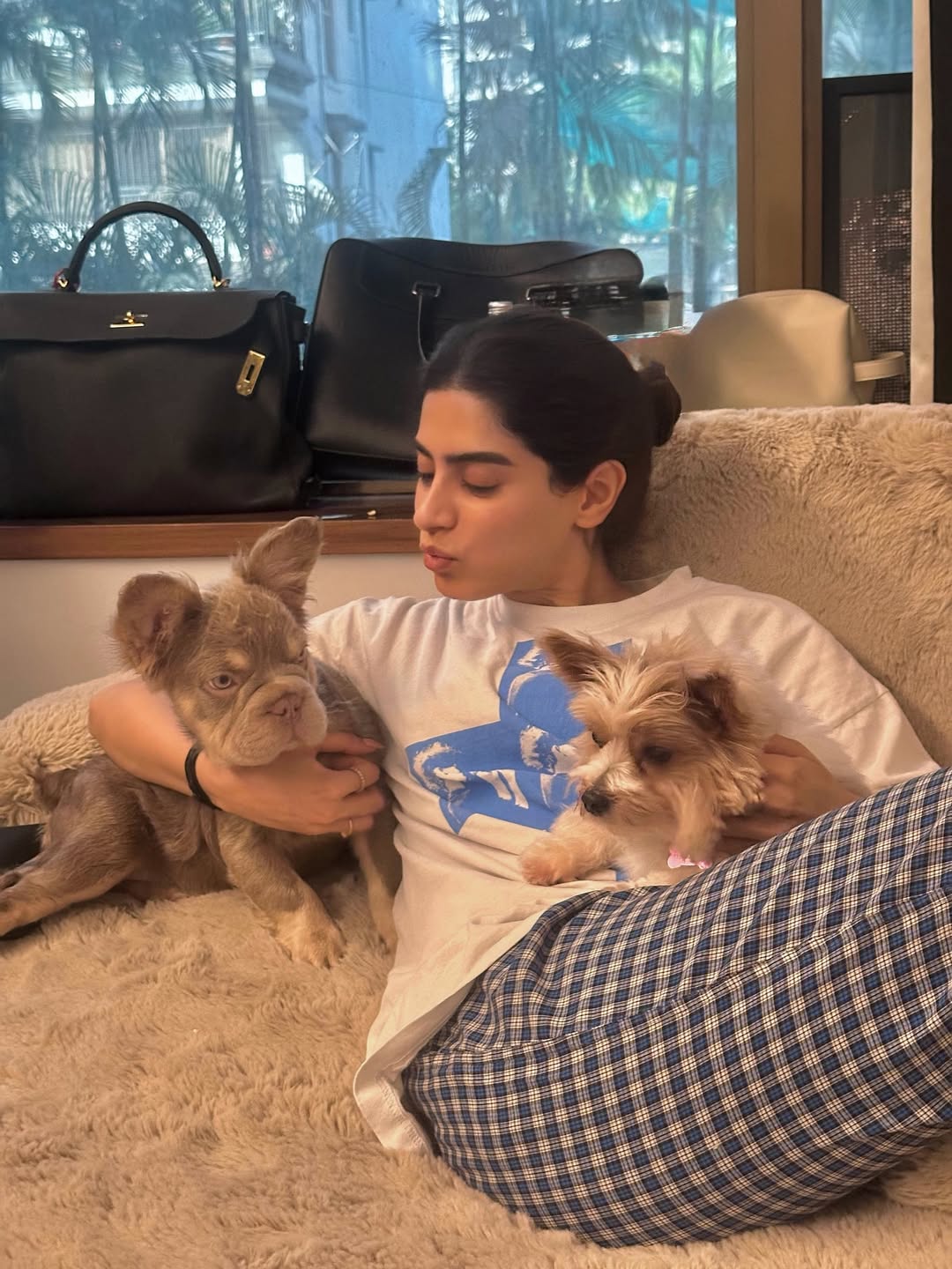 Khushi Kapoor has once again charmed her fans on Instagram by sharing a series of cozy and heartwarming pictures today. In one of the pictures, she is seen relaxing at home in a casual avatar wearing a comfy t-shirt and checkered pajamas while holding her two adorable pet dogs. The picture captures a candid and sweet moment where Khushi is showering love on her furry friends.