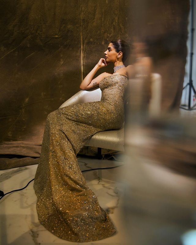 In her Instagram picture, Khushi dress was set by Anamika Khanna. Her look is completed with emerald and diamond jewelry by Gems & Jewels Palace. Her makeup is by Sushmita Vankar. Her hair is done by Sourav Roy. Styling is by Nandita Kalra and Kaveri Sharma. Photo is taken by Madhu Akula. The caption is Manifest. The background and soft lighting give a royal touch to the look.