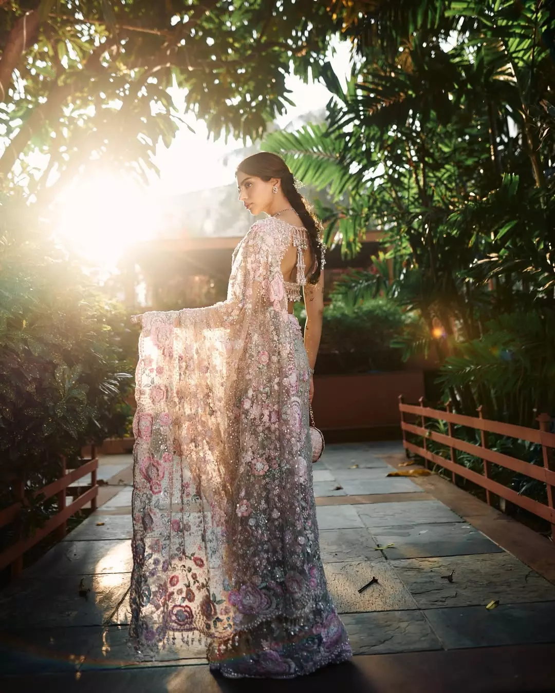 Khushi Kapoor blooms like a dream in golden-hour light, draped in a delicate pastel floral saree that’s pure poetry. The sheer fabric adorned with intricate hand-embroidered roses and sequins catches the sun, while her soft bun with gajra and diamond jewellery add timeless grace. Leaning against a rustic bench surrounded by greenery, she radiates serene bridal elegance. She captioned the ethereal frame: “Celebrating @shaunagautam