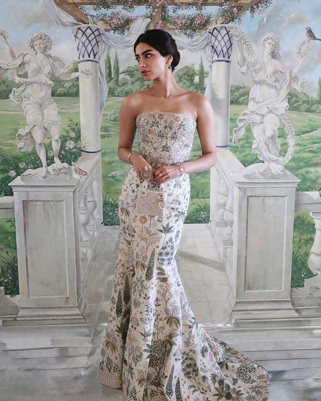 Khushi Kapoor is once again stealing the spotlight with her dreamy fashion moment captured in a Instagram post captioned “Au revoir” paired with a soft wave emoji. The pics she Khushi in a strapless floral embroidered gown that blends vintage charm with modern grace. The pic is set against a grand mural of classic sculptures and blooming gardens.