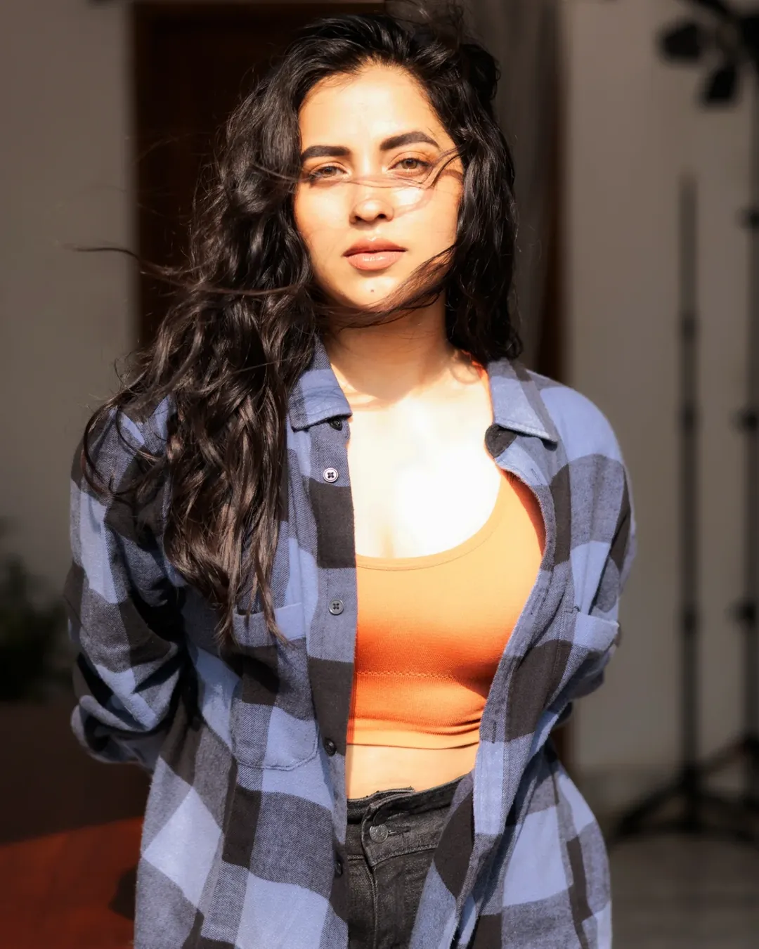 Actress Komalee Prasad once again proves that simplicity is the ultimate style statement. Posing against a rustic brick backdrop with a breezy highway view behind her, the talented beauty looks radiant and refreshingly natural. Dressed in a classic dark green fitted top paired with distressed blue jeans, Komalee strikes the perfect balance between casual comfort and modern glam.