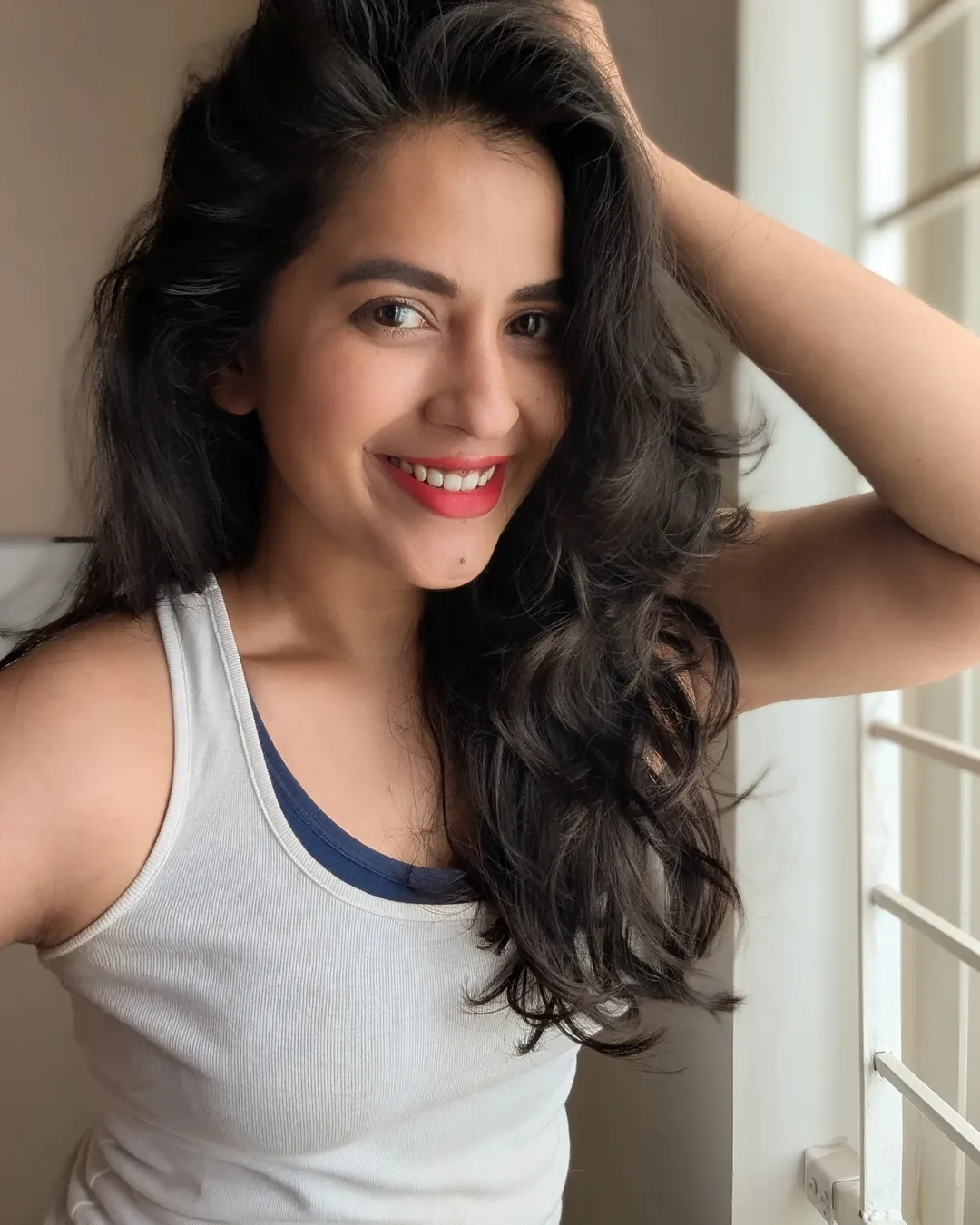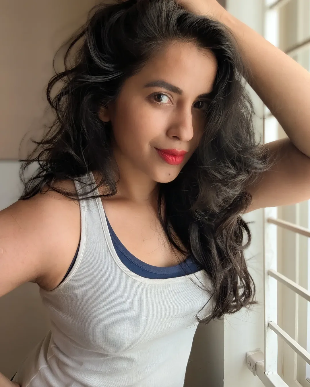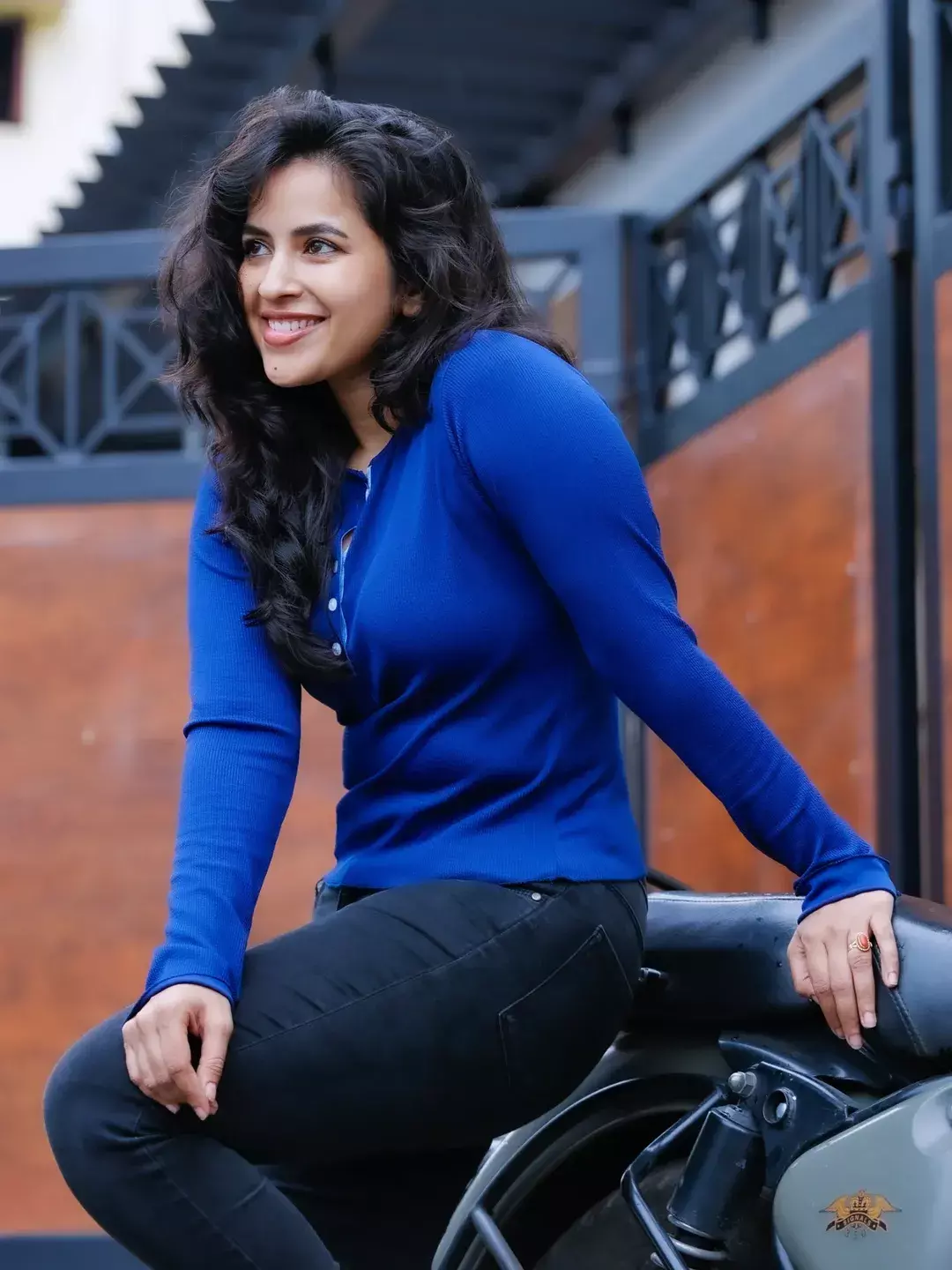 Her effortless smile and flowing hair add a lively charm to the frame, making the picture feel candid and full of warmth. Leaning casually against the railing, she exudes confidence and positivity. The minimal styling enhances her natural beauty, letting her expressive eyes and cheerful aura take center stage.