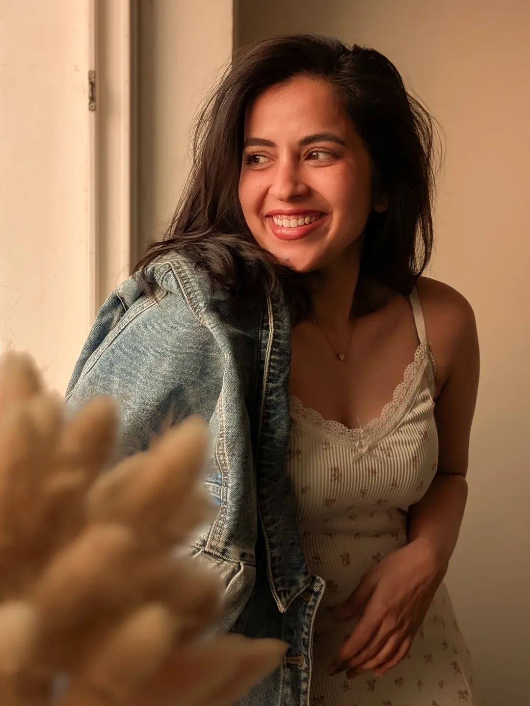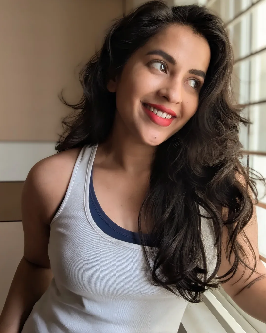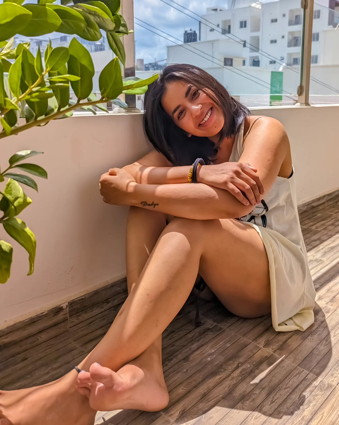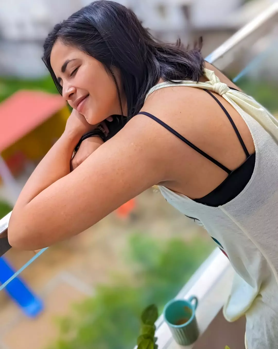 Her effortless smile and flowing hair add a lively charm to the frame, making the picture feel candid and full of warmth. Leaning casually against the railing, she exudes confidence and positivity. The minimal styling enhances her natural beauty, letting her expressive eyes and cheerful aura take center stage.