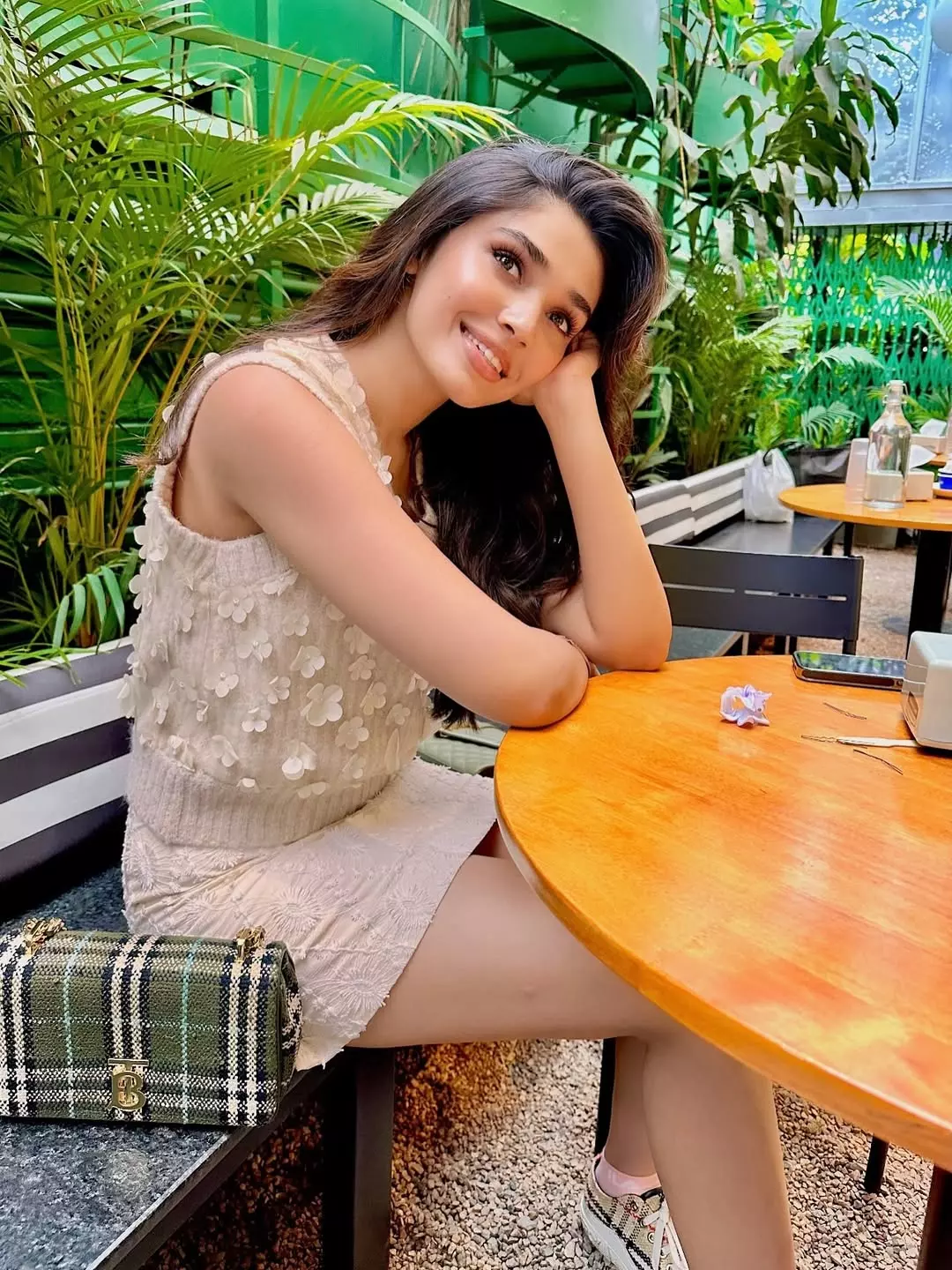 In recent Instagram post, Krithi Shetty exudes confidence and style. She dons a black strapless top paired with a white patterned skirt and black thigh-high boots. Her caption, read "Confidence is the best outfit, own it and rock it.” The photo is styled by Sheefa J. Gilani and captured by photographer Vidhigodha.