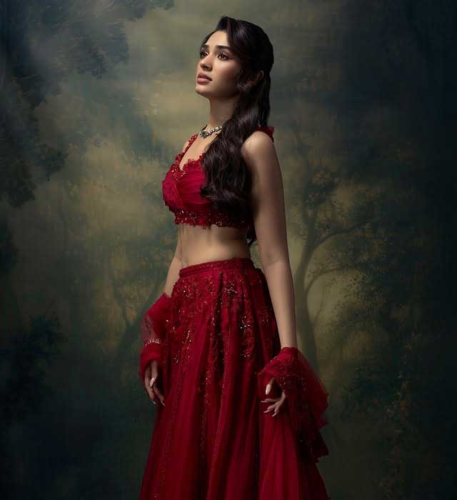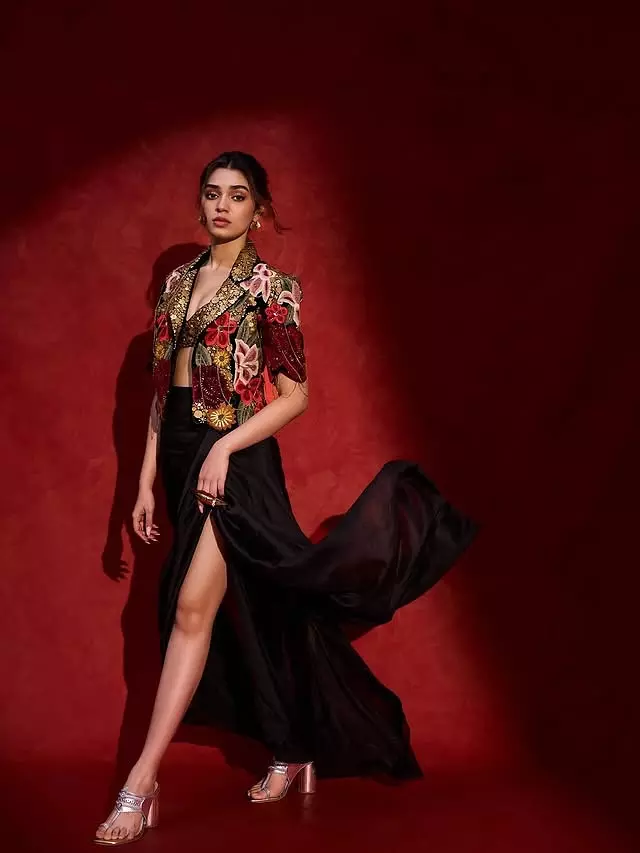 By: Tupaki Desk | 14 Sept 2025 7:00 AM ISTKrithi Shetty’s latest photodump is pure fire a visual symphony of bold fashion and fierce presence. Dressed in a heavily embellished cropped jacket over a bronze-sequined bustier and paired with a modern black draped skirt, Krithi makes a case for regal-meets-runway. The intricate floral embroidery, mirror work, and dramatic red backdrop highlight her fearless style evolution. With minimal accessories and that signature intense gaze, she balances grace with power and every frame is proof.