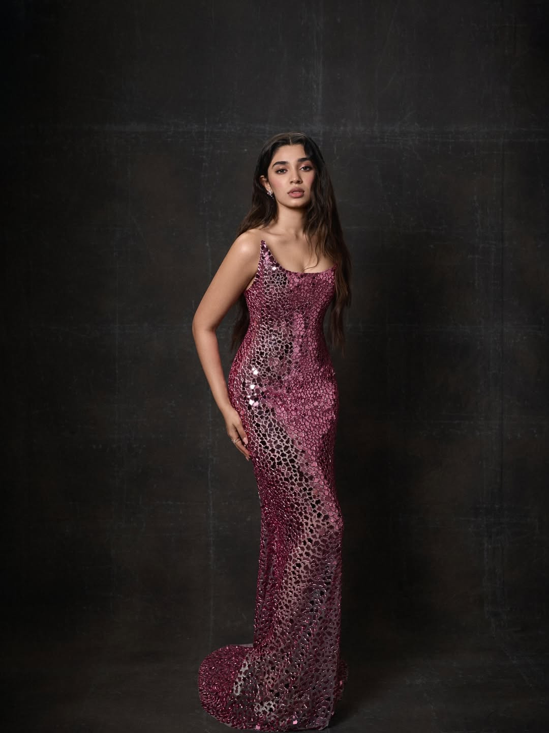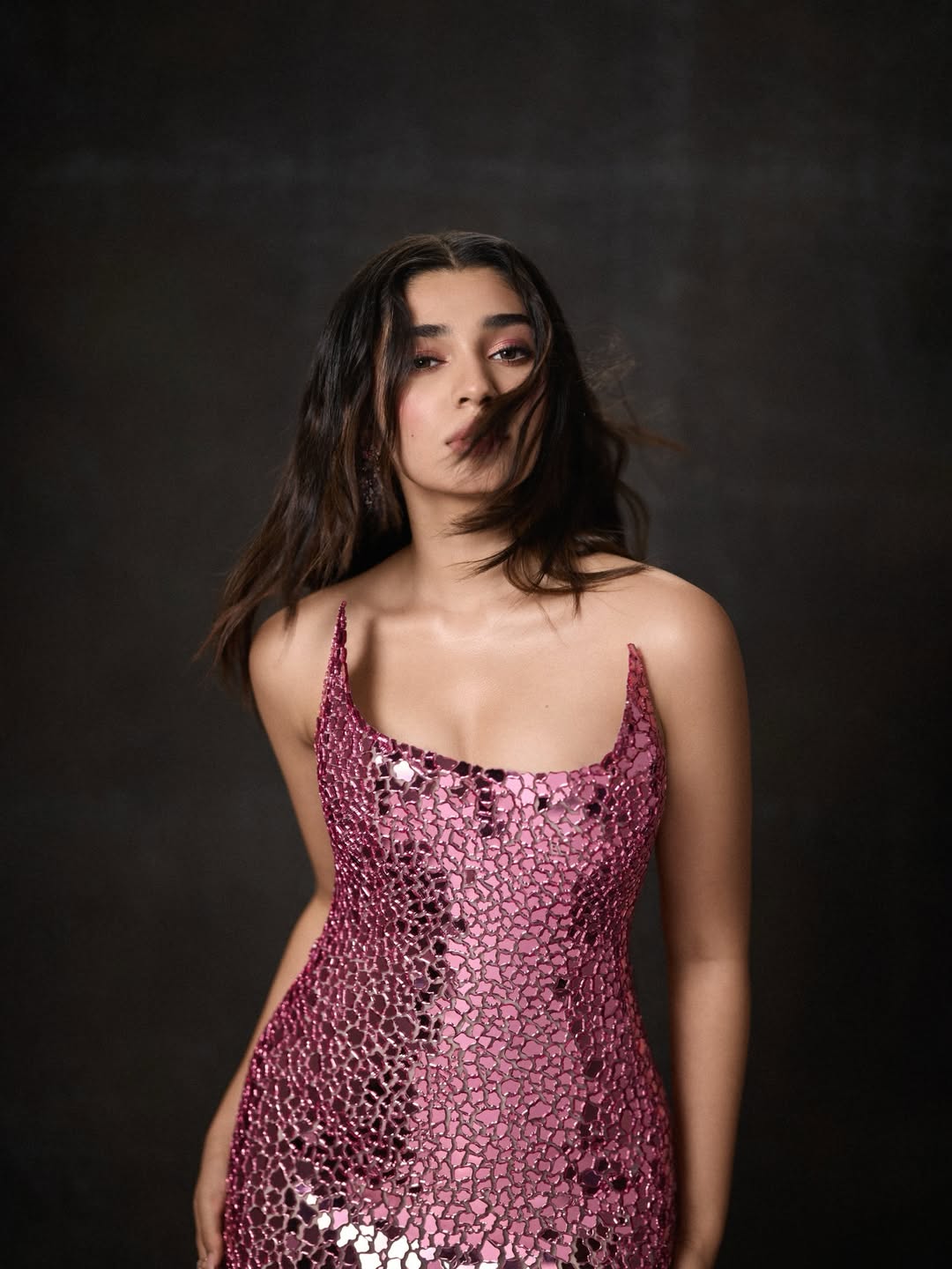 Radiating elegance and modern glamour, Krithi Shetty steps into a dazzling new phase with her stunning photoshoot, perfectly capturing the vibe of “Dheema era begins 💖.” Draped in a shimmering, body-hugging sequined gown, she exudes confidence and poise, proving yet again why she remains one of the most admired young stars in South Indian cinema. The soft lighting and minimalistic backdrop elevate her natural beauty, while her subtle expressions add depth to every frame.