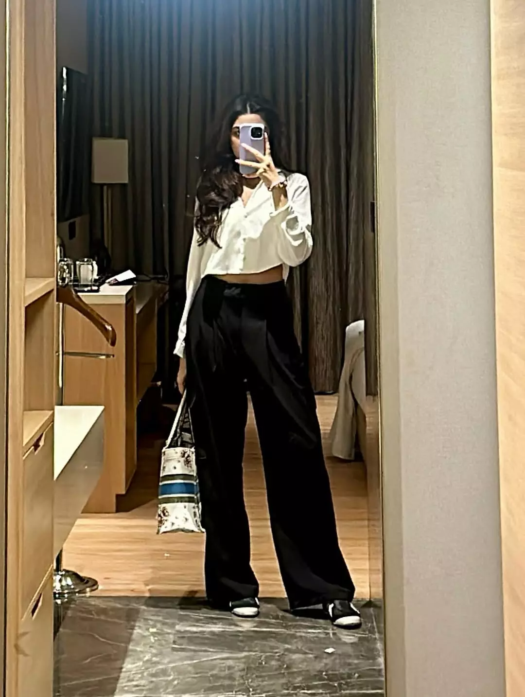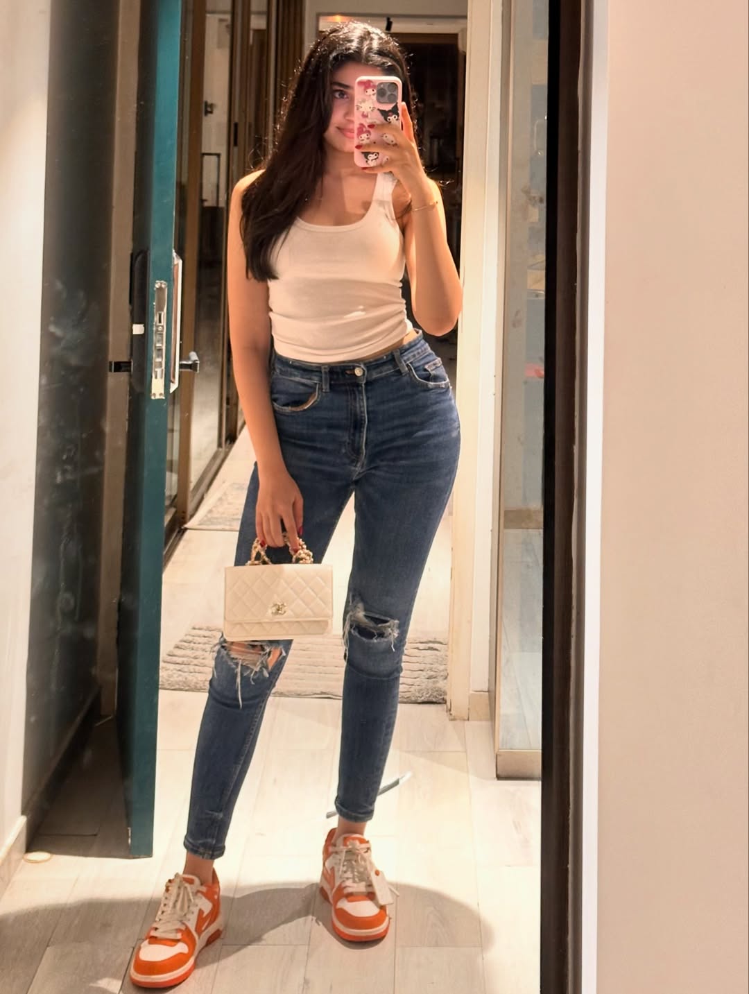She stood in front of a wooden door and clicked her reflection as she wore a denim vest paired with ripped jeans. She completed her look with sneakers.