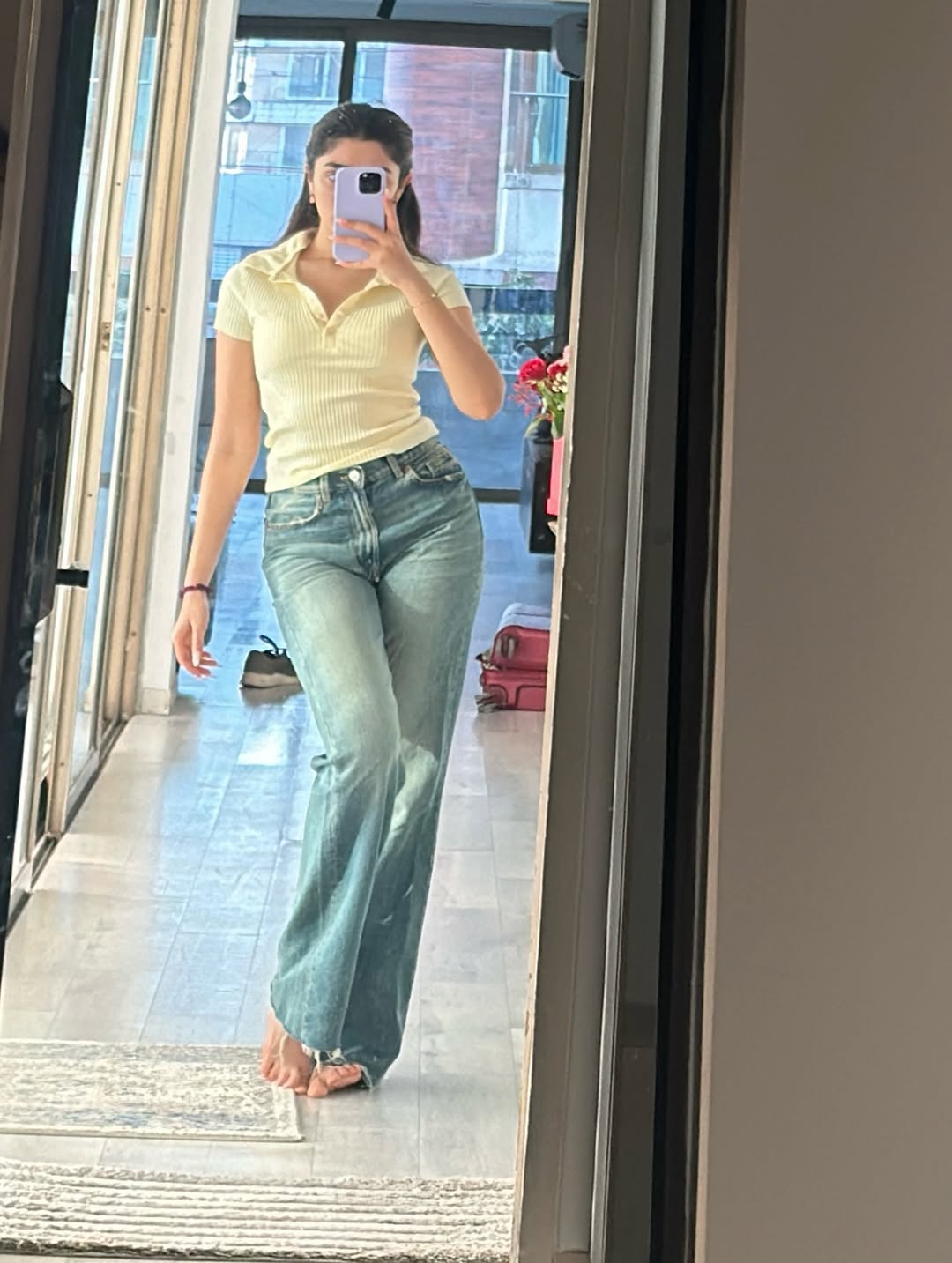 Krithi Shetty shared a mirror selfie on Instagram. She stood in front of a wooden door and clicked her reflection as she wore a denim vest paired with ripped jeans. She completed her look with sneakers. She carried a casual and relaxed vibe.
