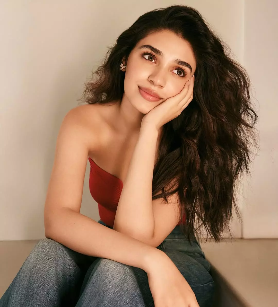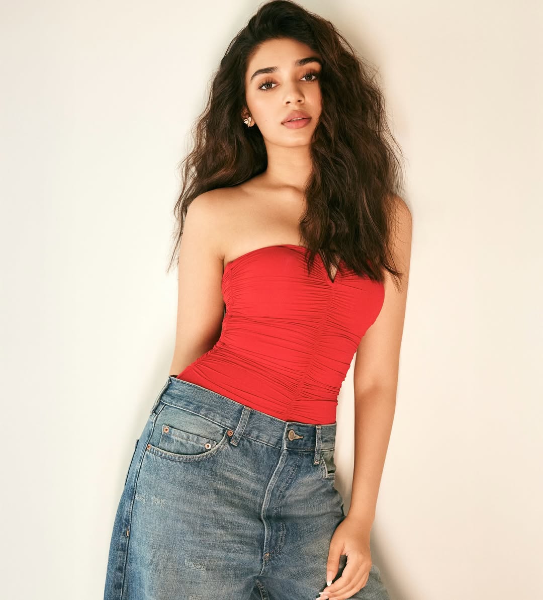 Krithi Shetty's latest Instagram post is an absolute vibe! She shares a l photo in a red strapless top paired with denim jeans, embodying effortless chic.