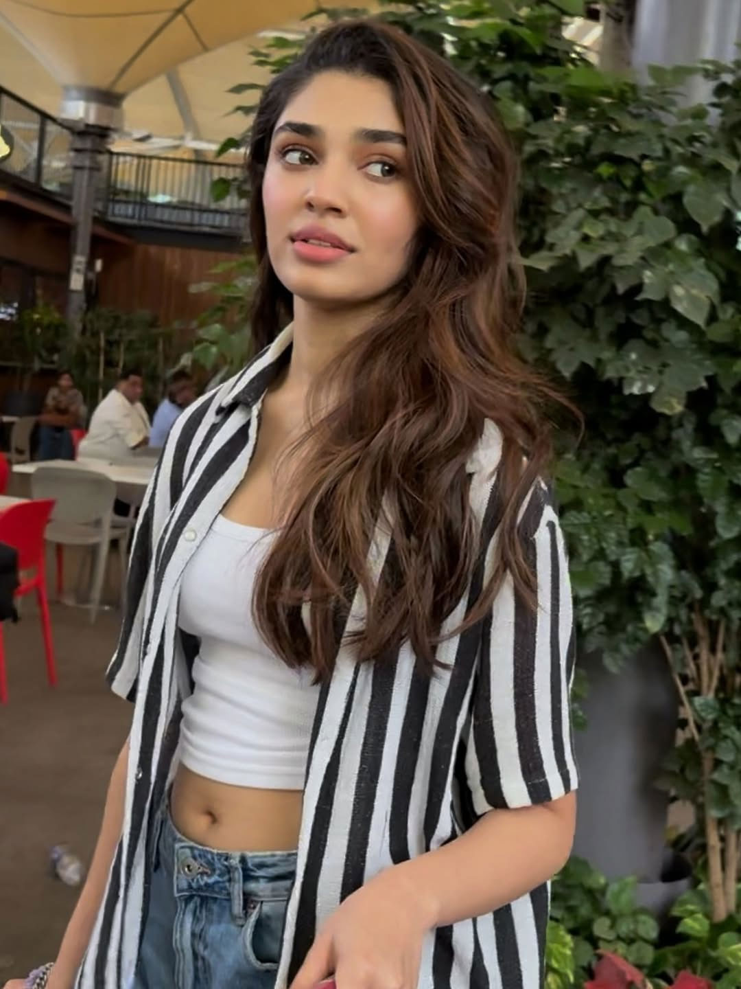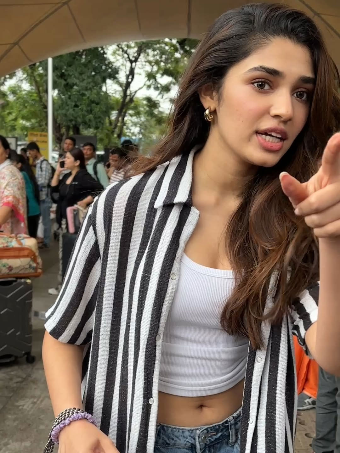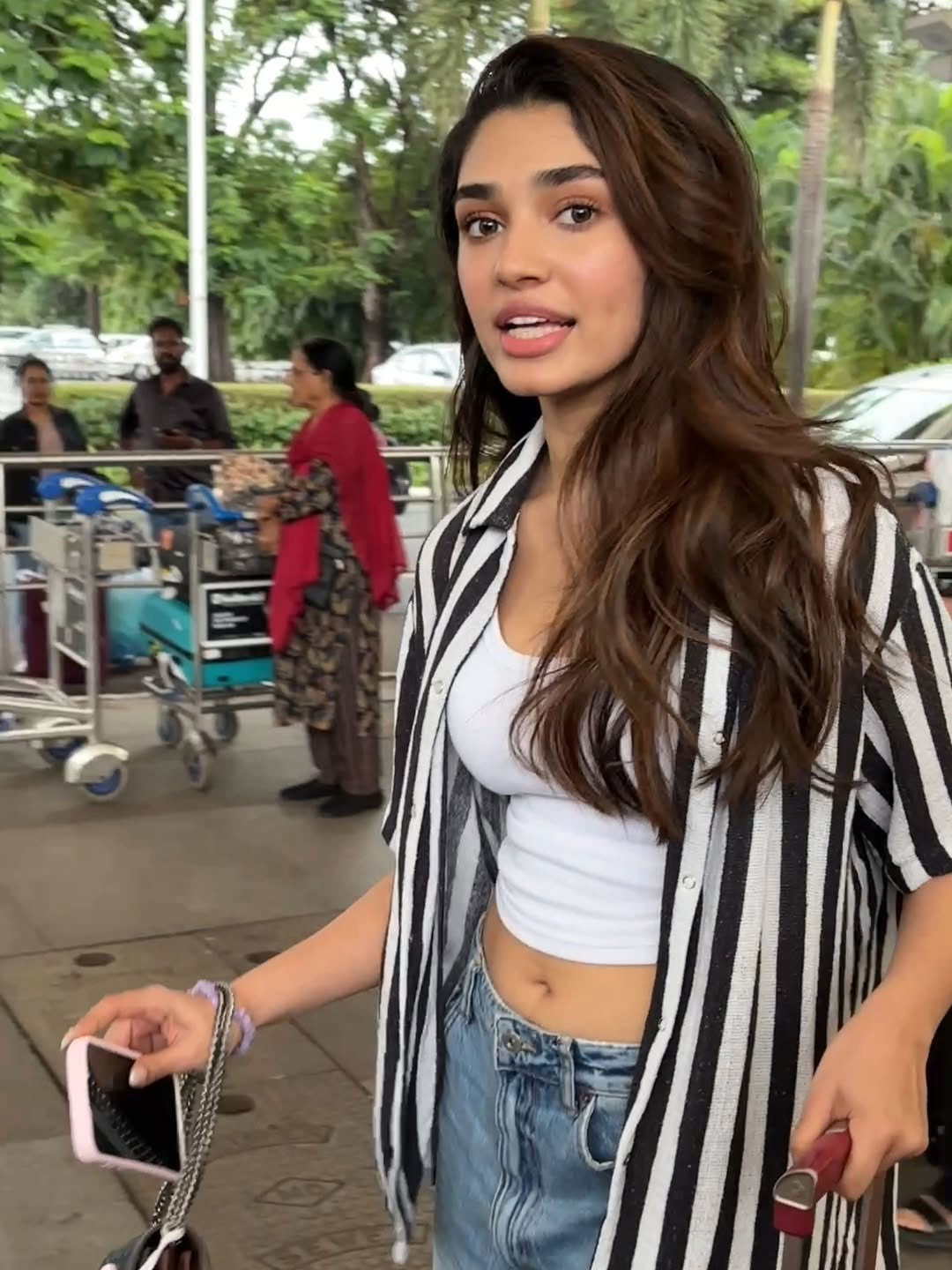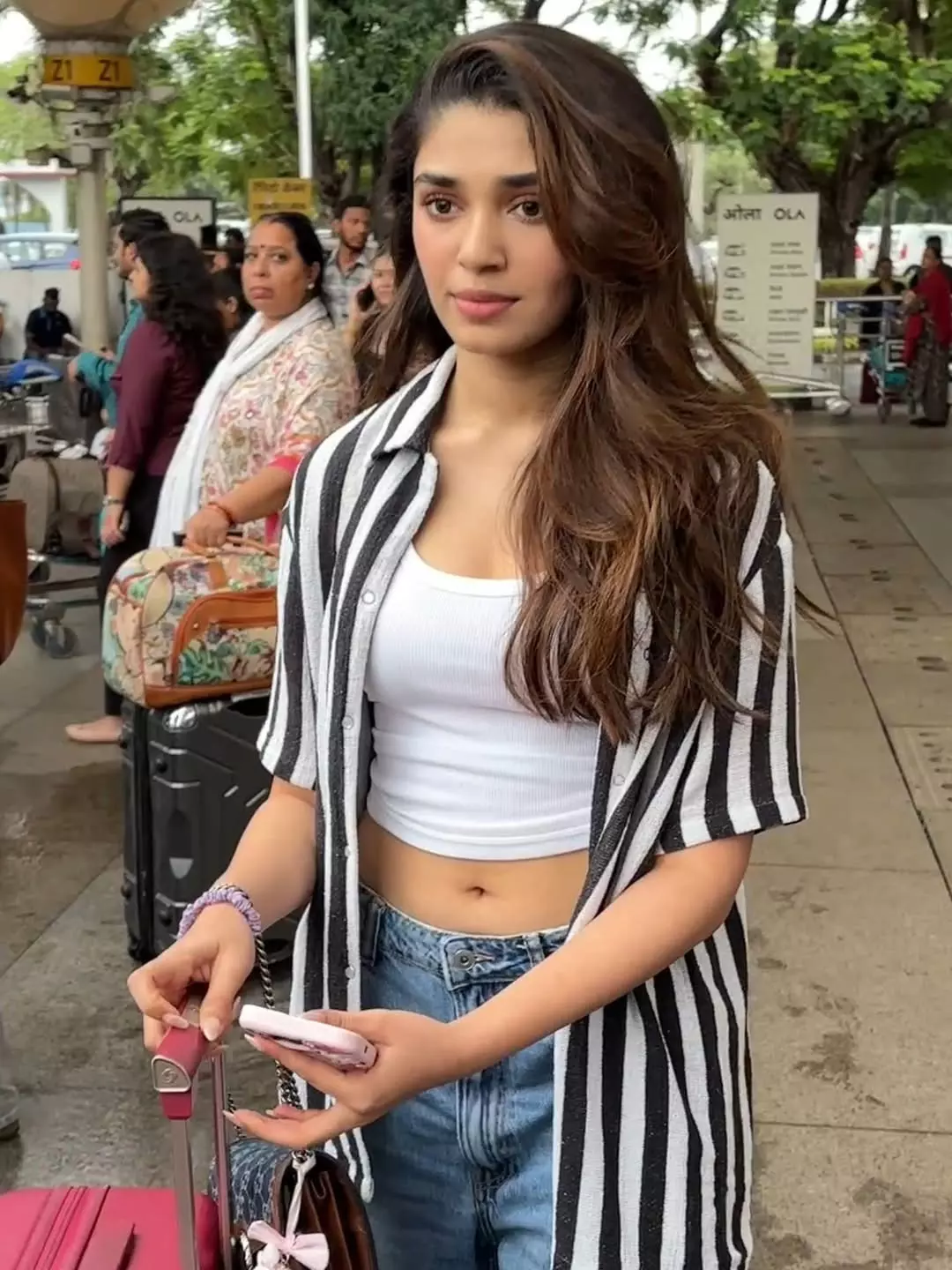 Krithi Shetty was recently seen at Mumbai airport, and her stylish look grabbed everyone’s attention. The actress was spotted wearing a white crop top paired with high-waist blue jeans. She completed her look with an open black-and-white striped shirt, giving a perfect casual yet classy airport style. With minimal makeup and her hair left open in soft waves, Krithi looked adorable and comfortable at the same time.