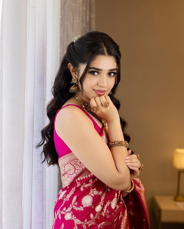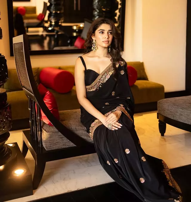 In this picture, she exudes timeless beauty in a black saree adorned with delicate embroidery, paired with elegant jewelry that enhances her classic appeal. Krithi’s saree looks often set major fashion goals for young fans who adore her traditional yet fresh style. Whether she’s portraying a village belle or a modern young woman, Krithi carries every role with poise and authenticity. Her blend of talent and grace makes her one of the most promising actresses in Telugu cinema today.