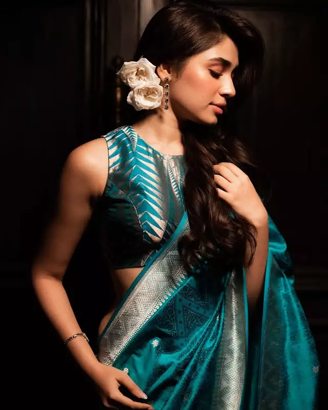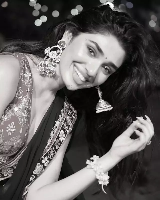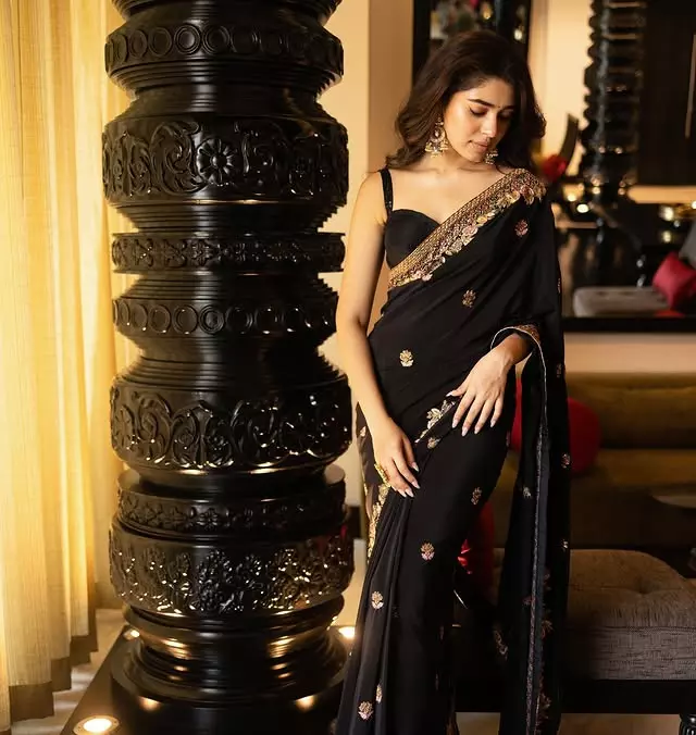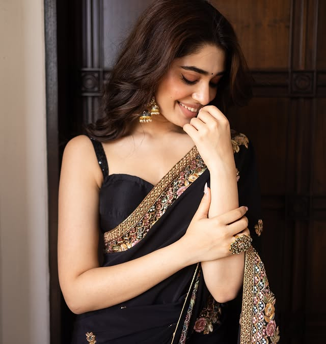In this picture, she exudes timeless beauty in a black saree adorned with delicate embroidery, paired with elegant jewelry that enhances her classic appeal.
