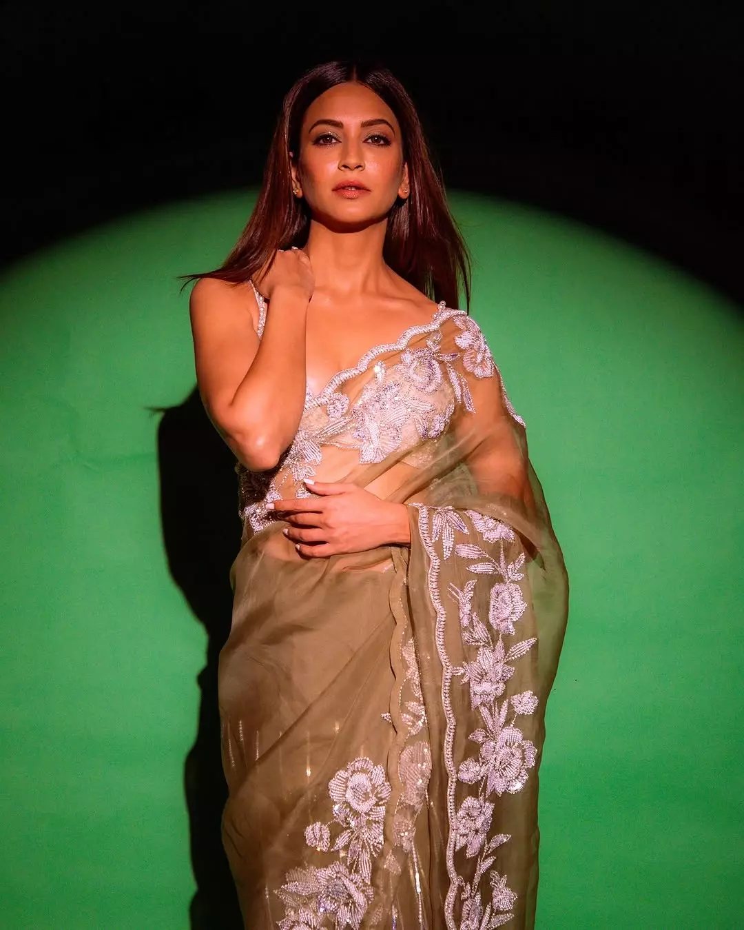 Kriti Kharbanda just turned the reception lights down low and the sparkle up high —a mocha sequin lehenga that hugs like liquid metal, slit high enough to make every step a statement. Her strapless corset blooms with 3D crystals, while that trailing dupatta pools like melted chocolate on the floor. Tousled waves, a barely-there navel piercing, and a gaze that says “I arrived fashionably late on purpose.” Wedding szn just found its after-party queen.
