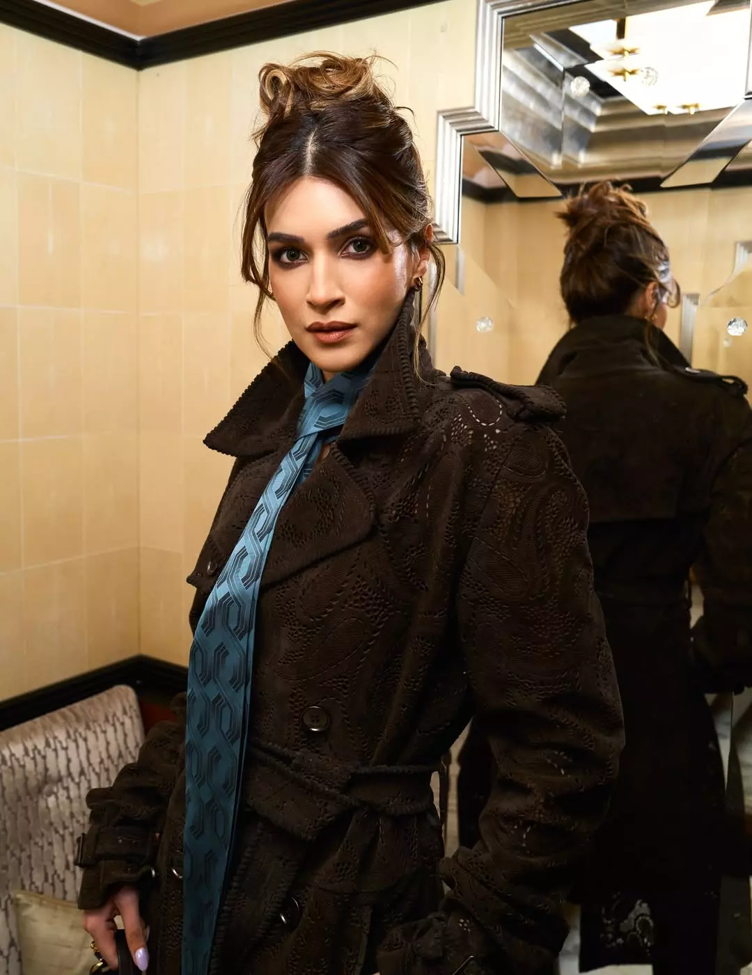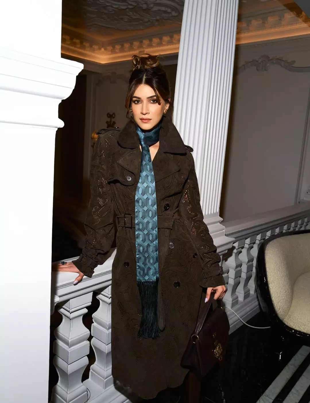 By: Tupaki Gallery Desk | 24 Feb 2026 10:13 PM ISTEffortlessly blending sophistication with contemporary edge, Kriti Sanon makes a striking style statement in this chic winter look. Dressed in a structured brown trench coat with subtle textured detailing, Kriti exudes confidence and power. The look is elevated with a patterned teal scarf that adds a refreshing pop of color, while her sleek updo and bold eye makeup enhance the sharp, polished vibe. Holding a classic handbag and posing against an elegant architectural backdrop, Kriti channels modern royalty with ease.