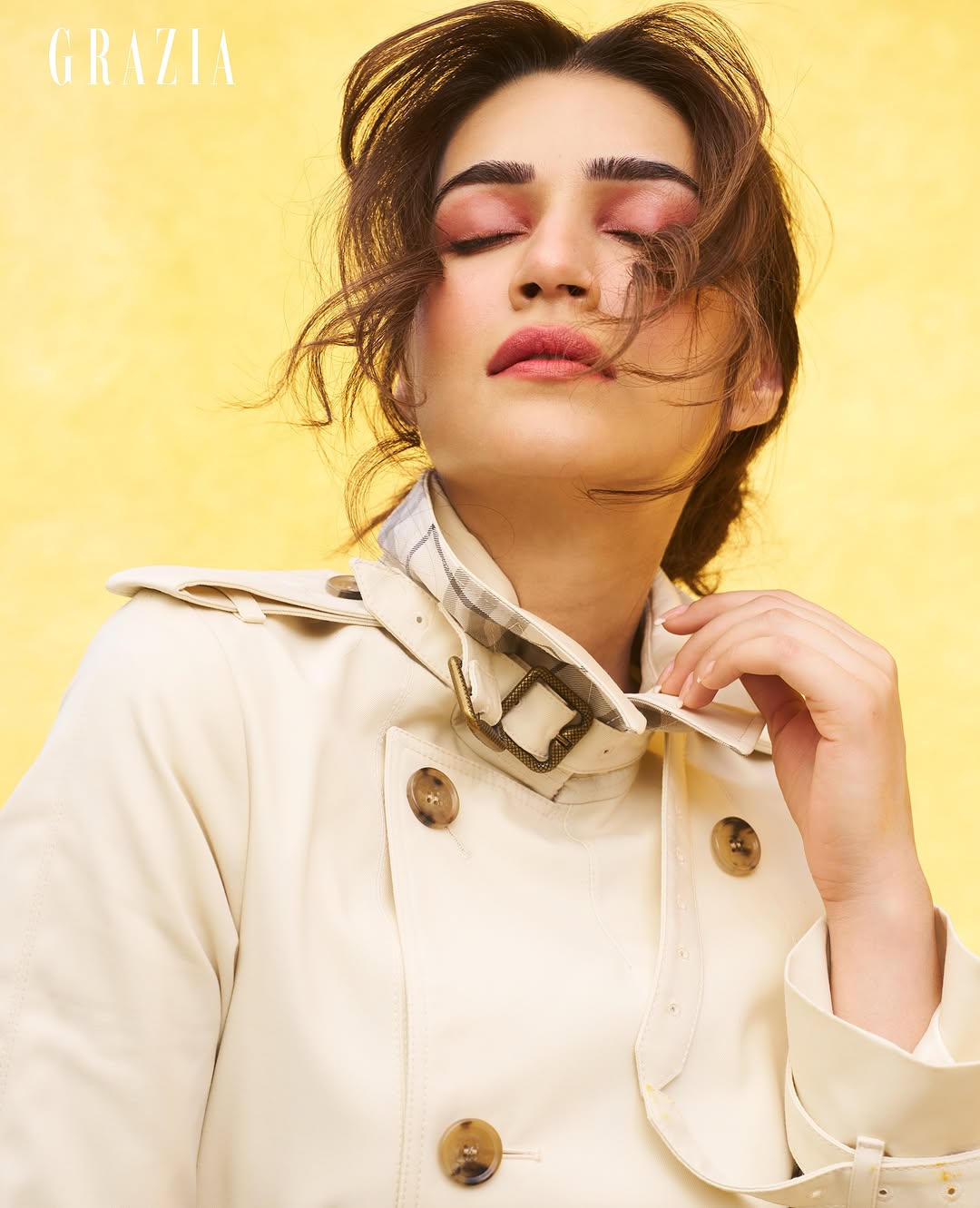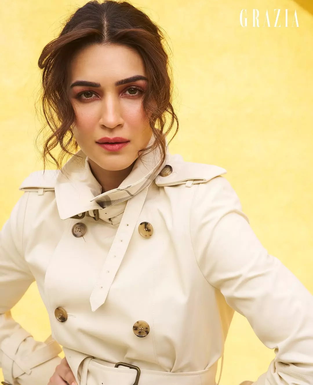 Kriti Sanon exudes fierce elegance and editorial flair in this striking monochrome ensemble for Grazia. Styled in a belted cream trench jacket and matching mini skirt, she owns the frame against a bold yellow backdrop, creating a stunning contrast that screams high fashion. With her confident stance, effortless poise, and minimal accessories, Kriti blends classic sophistication with a contemporary edge, making this look an absolute head-turner.