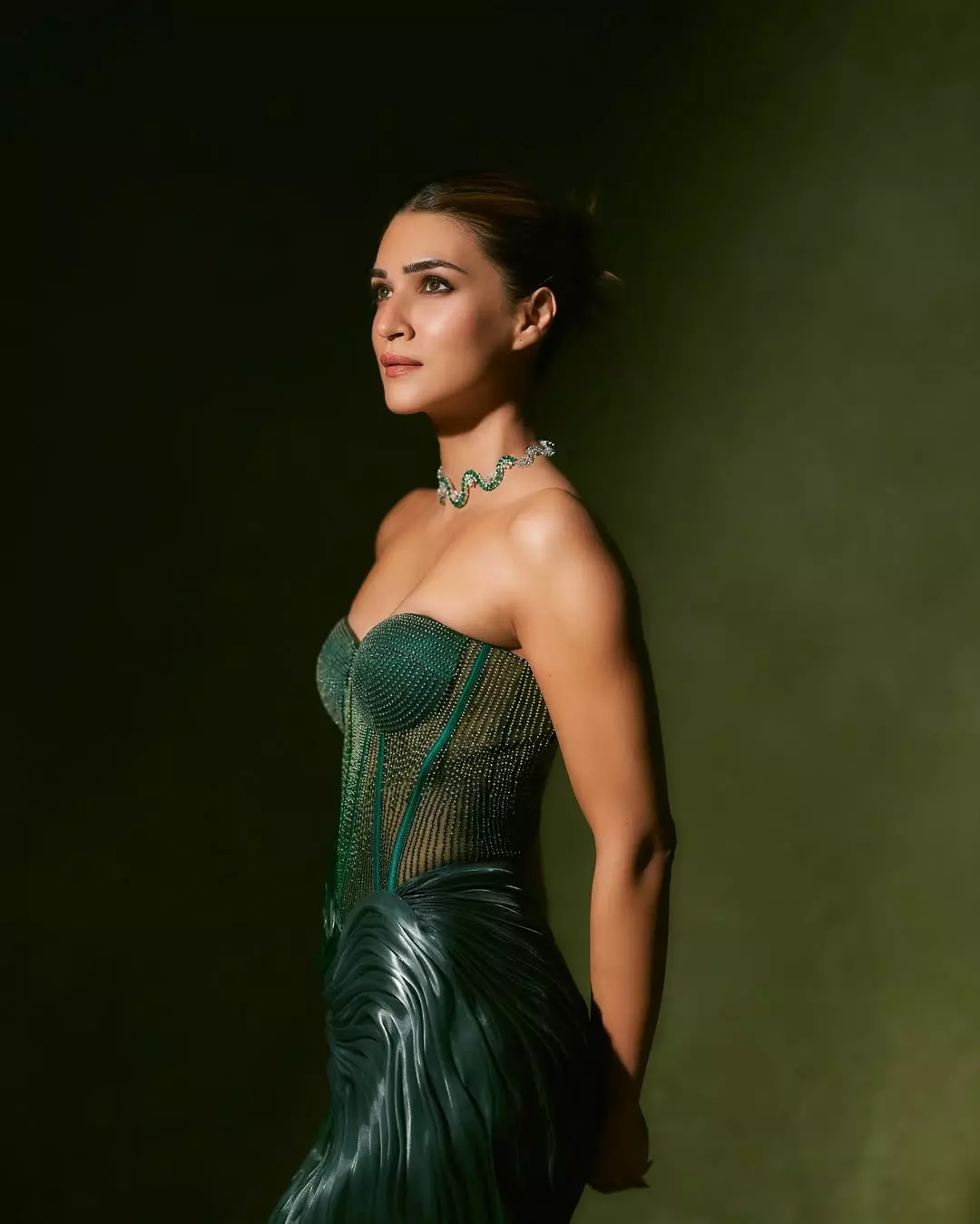 In the photo, Kriti looks confident and graceful in a green strapless gown, featuring a sculpted corset design and artistic patterns, looked like a work of art. With her hair neatly tied back and soft makeup, Kriti wore emerald green necklace.