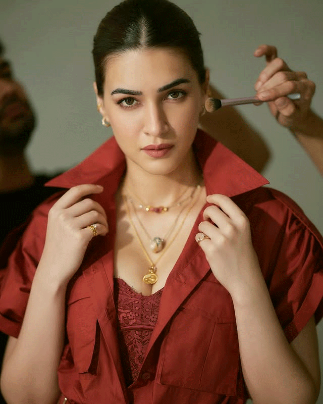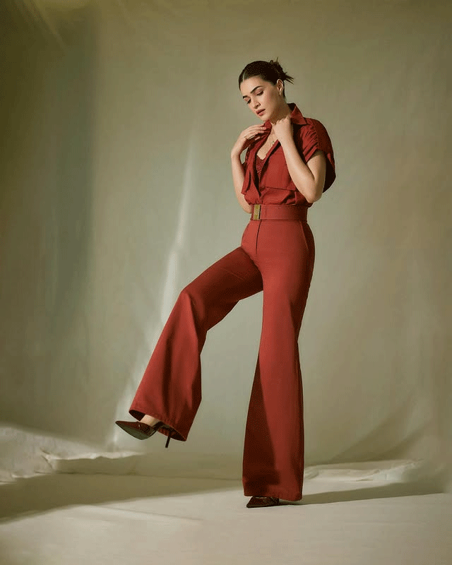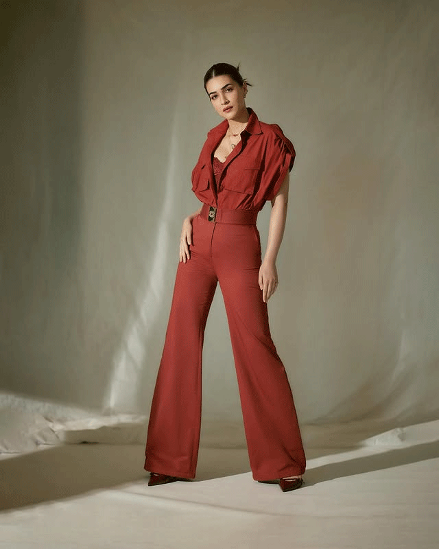 Kriti Sanon is creating waves in Instagram. She is seen in a red ensemble that looks both chic and contemporary. The attire includes a stylish shirt with a belted waist and high-waisted pants that add a modern twist to a classic silhouette. Kriti accessorized the look with delicate gold jewelry, including a layered necklace, earrings and a ring.