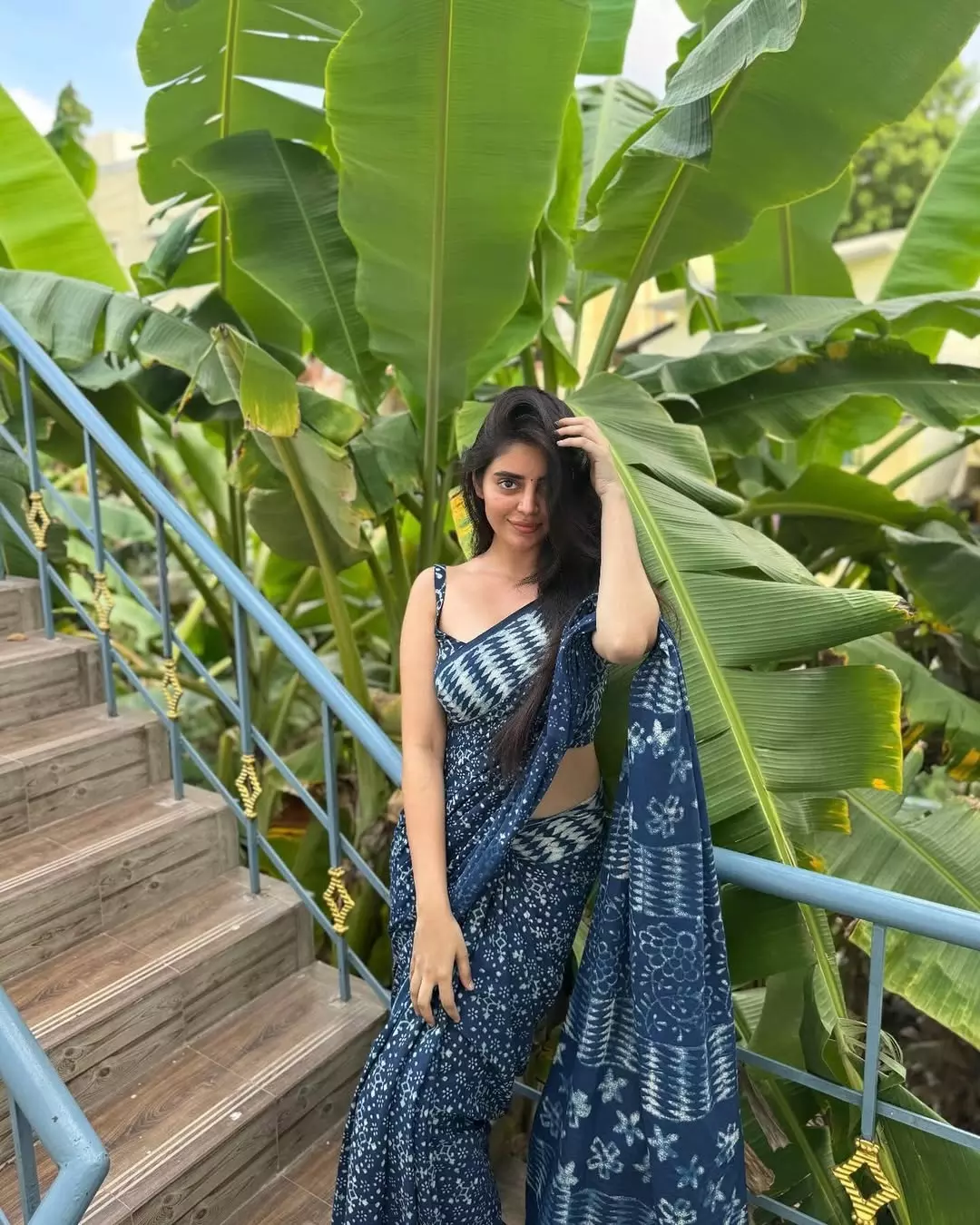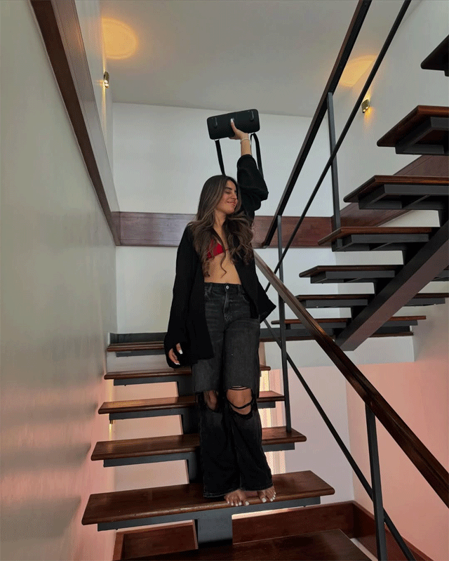 The actress posted a striking picture of herself on a stylish staircase, confidently holding a speaker above her head.