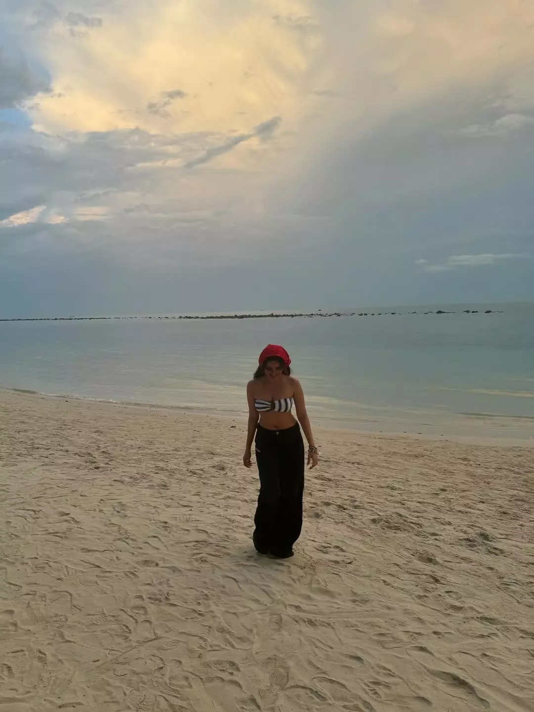 Kushitha Kallapu is making waves on Instagram with her casual beach style as seen in her recent post. The photo shows her walking along the beach in a striped top and a black skirt accessorized with a red bandana.