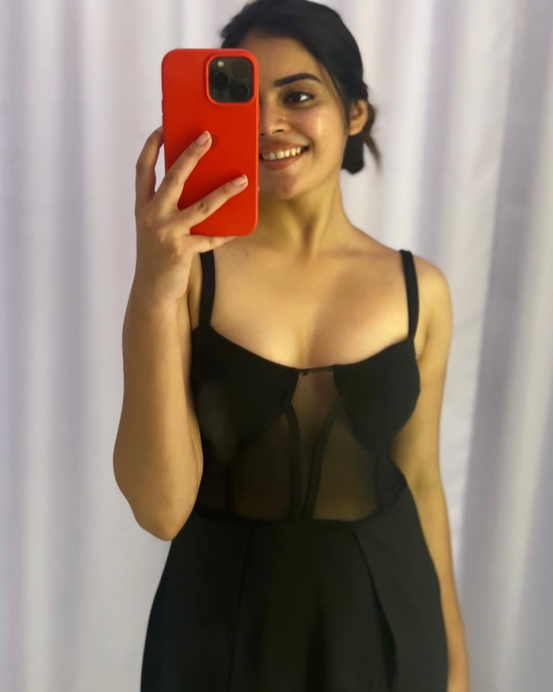 The alluring mirror selfie photo shows Kushitha in a sleek black sheer-paneled corset dress with spaghetti straps and a fitted bodice, capturing her toned figure and radiant smile. Holding a vibrant red iPhone case to obscure half her face, her messy bun, bold brows, subtle makeup, and playful gaze against a neutral backdrop exude modern sensuality, confidence, and effortless glamour.