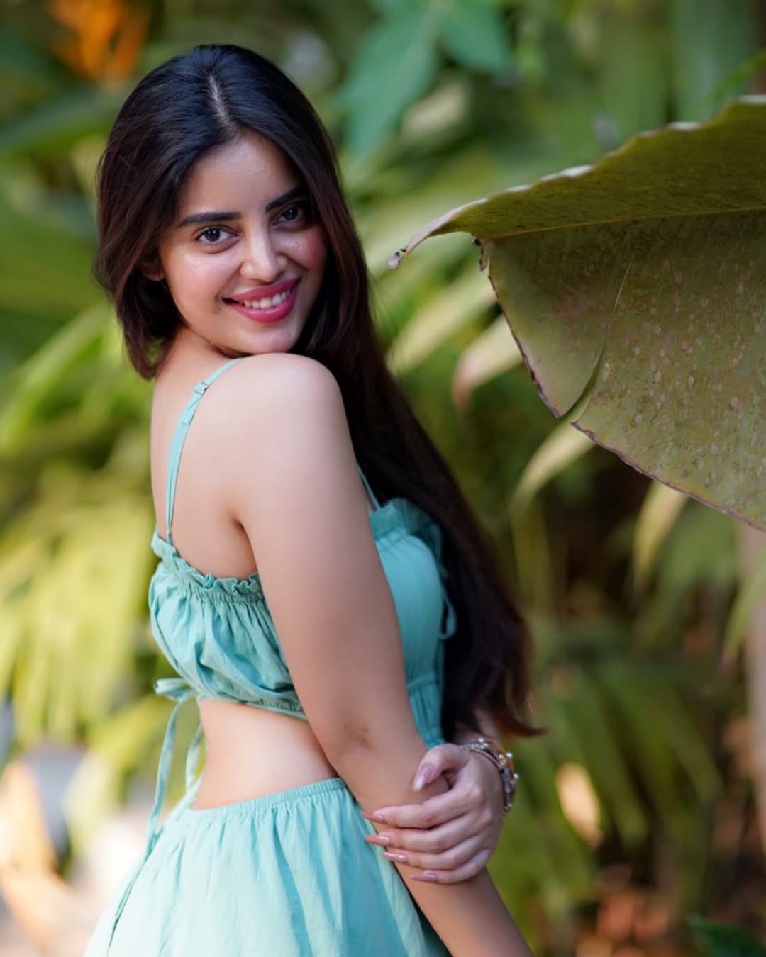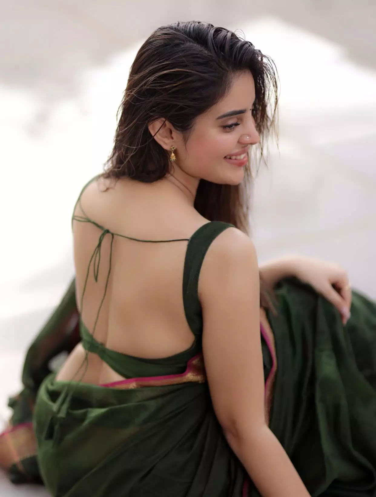 The subtle textures and minimalistic design of her outfit highlight her natural beauty, while the neatly styled hair and light makeup enhance her soft features. With delicate accessories and a warm smile, Kushitha brings a sense of authenticity and comfort to the frame, making the look feel both festive and personal. The serene home-style backdrop, filled with greenery and earthy elements, further complements her grounded and elegant vibe.