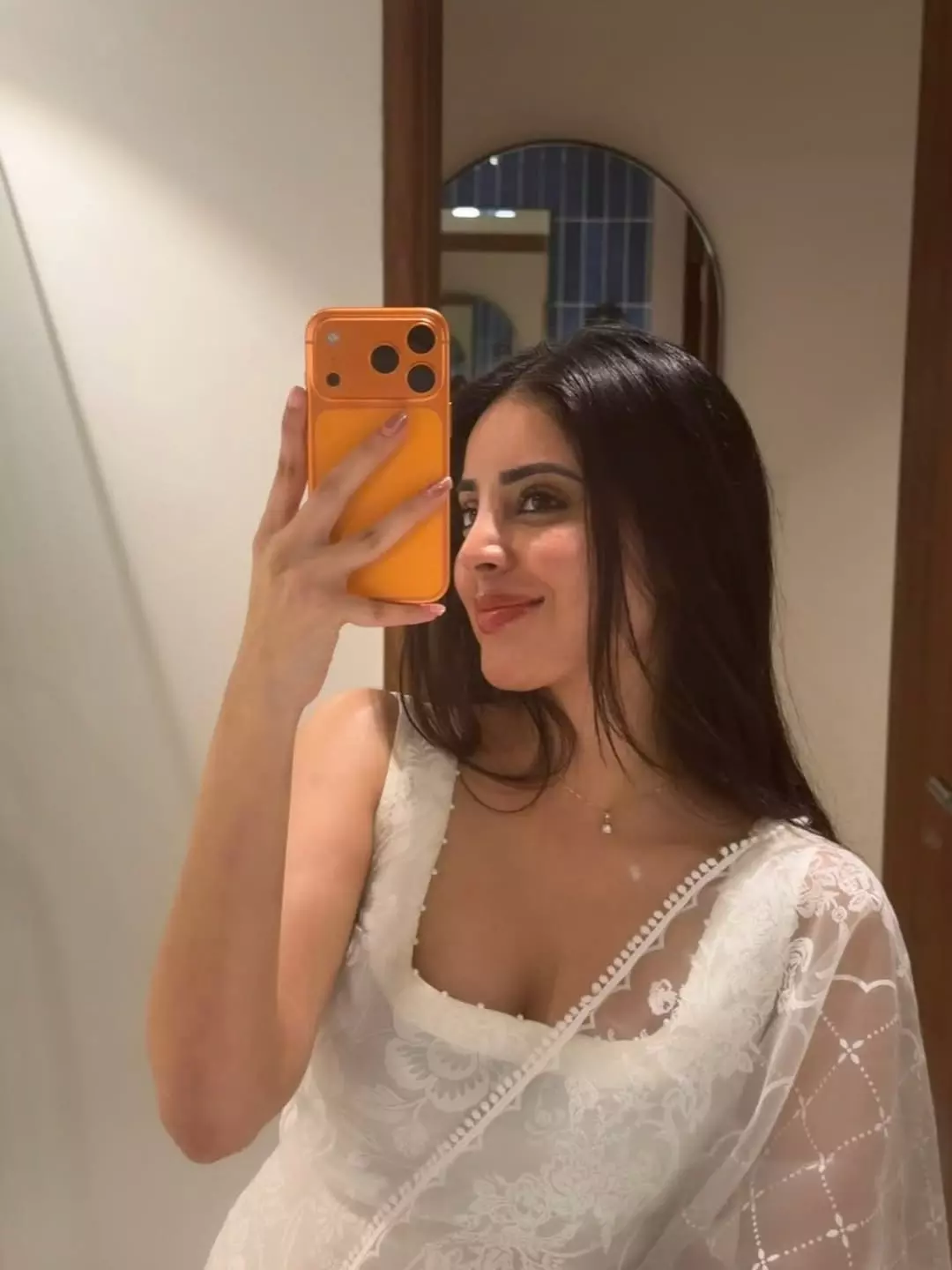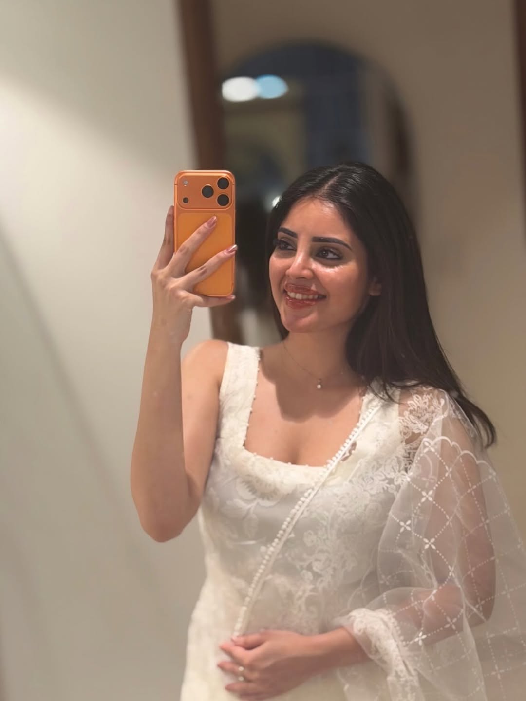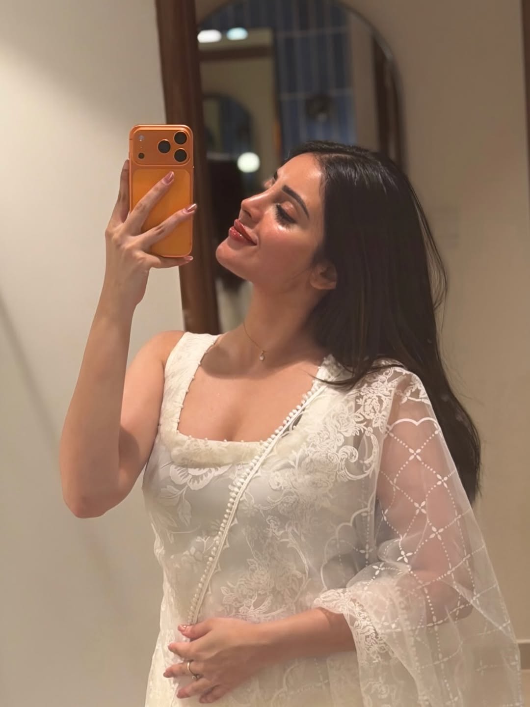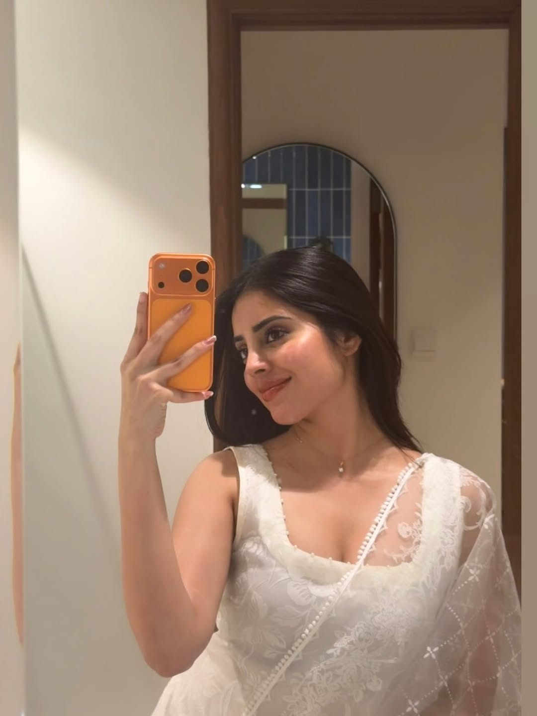 Kushitha Kallapu looks stunning in her latest mirror selfie photos, dressed in an elegant white lace saree with delicate embroidery and pearl detailing. With her radiant smile, glowing skin, and confident pose while holding an orange phone, she exudes charm, grace, and modern elegance that perfectly highlights her beauty and style.