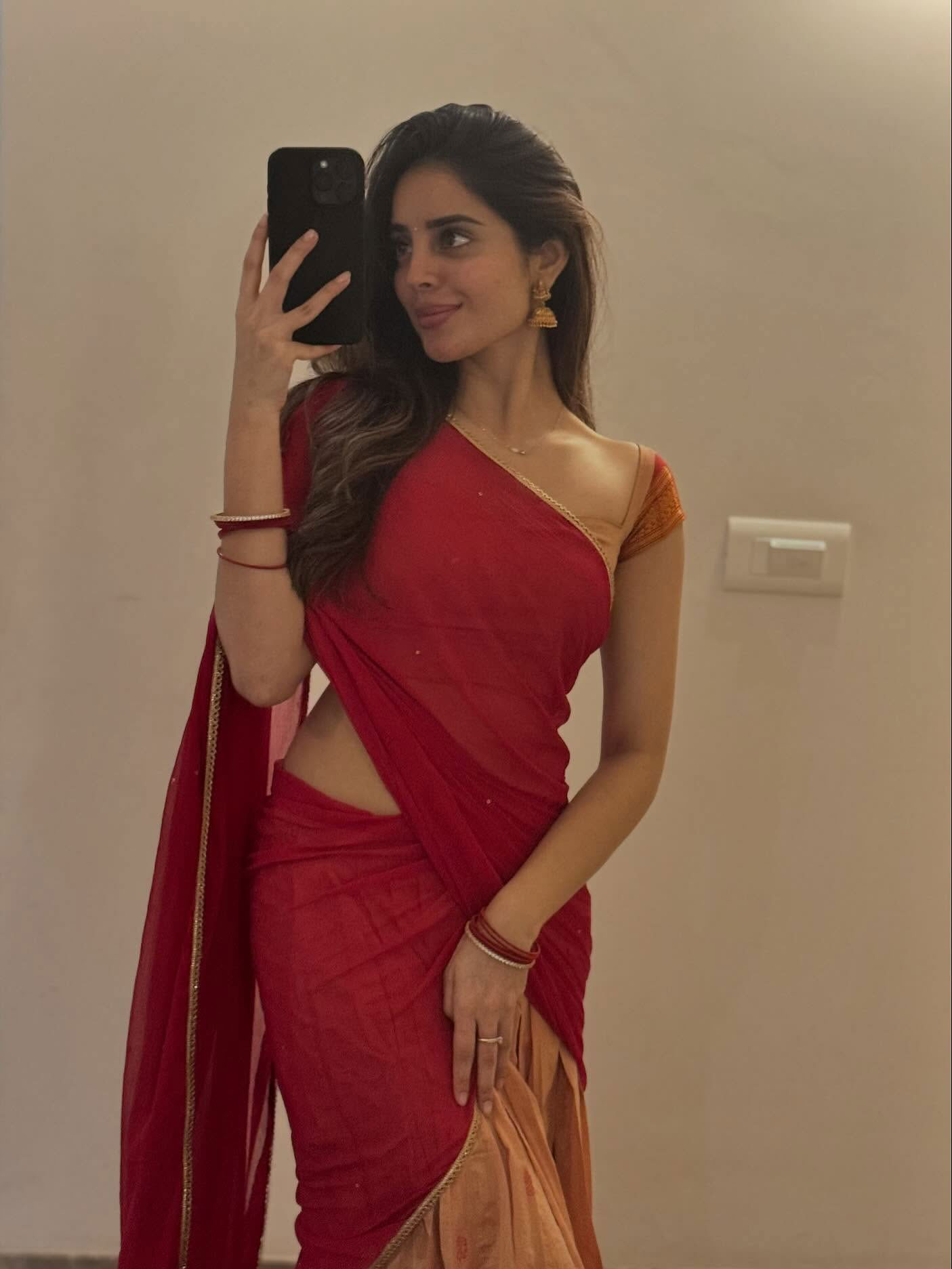 With her radiant smile, glowing skin, and confident pose while holding an orange phone, she exudes charm, grace, and modern elegance that perfectly highlights her beauty and style.