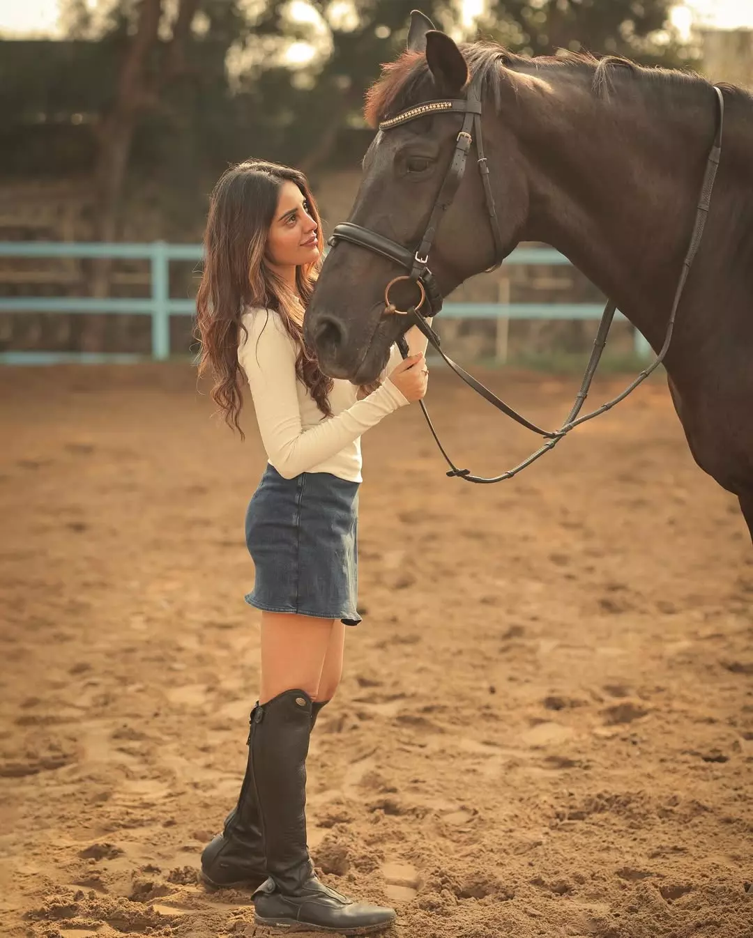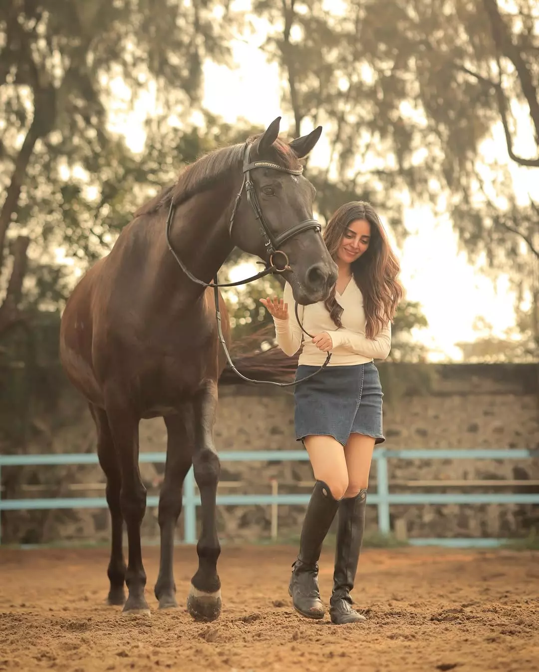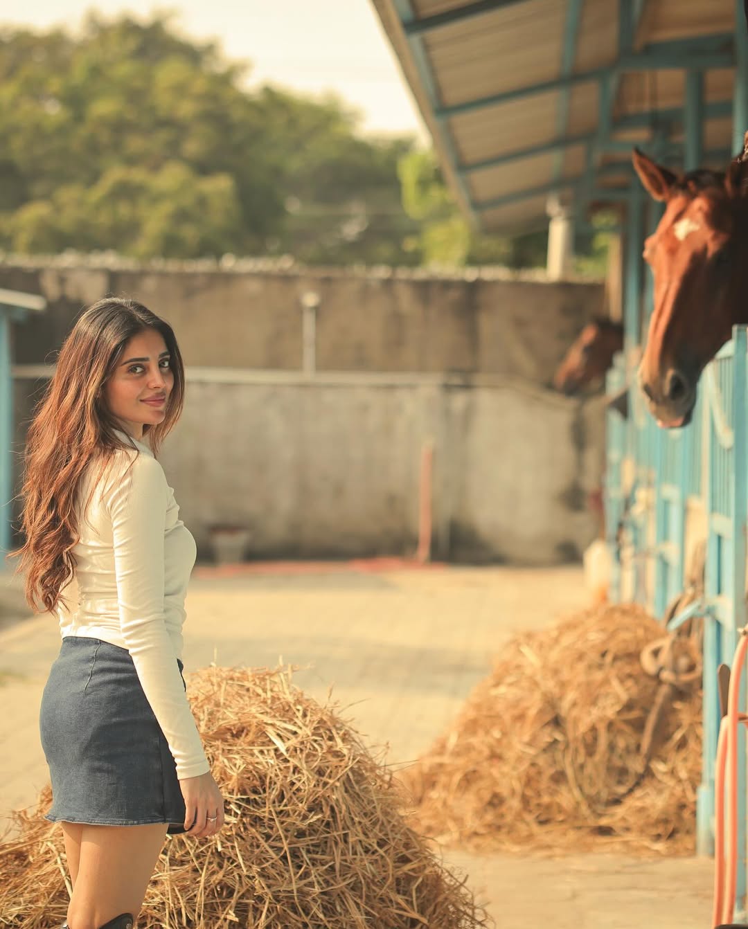 Kushitha Kallapu wraps her arms around a glossy black stallion, cream long-sleeve riding top tucked into a denim mini while tall boots dig into golden sand. Wind-tossed hair frames a megawatt smile—she’s pure stable-side sunshine. The Tellavarsham star just turned a dusty arena into her catwalk.