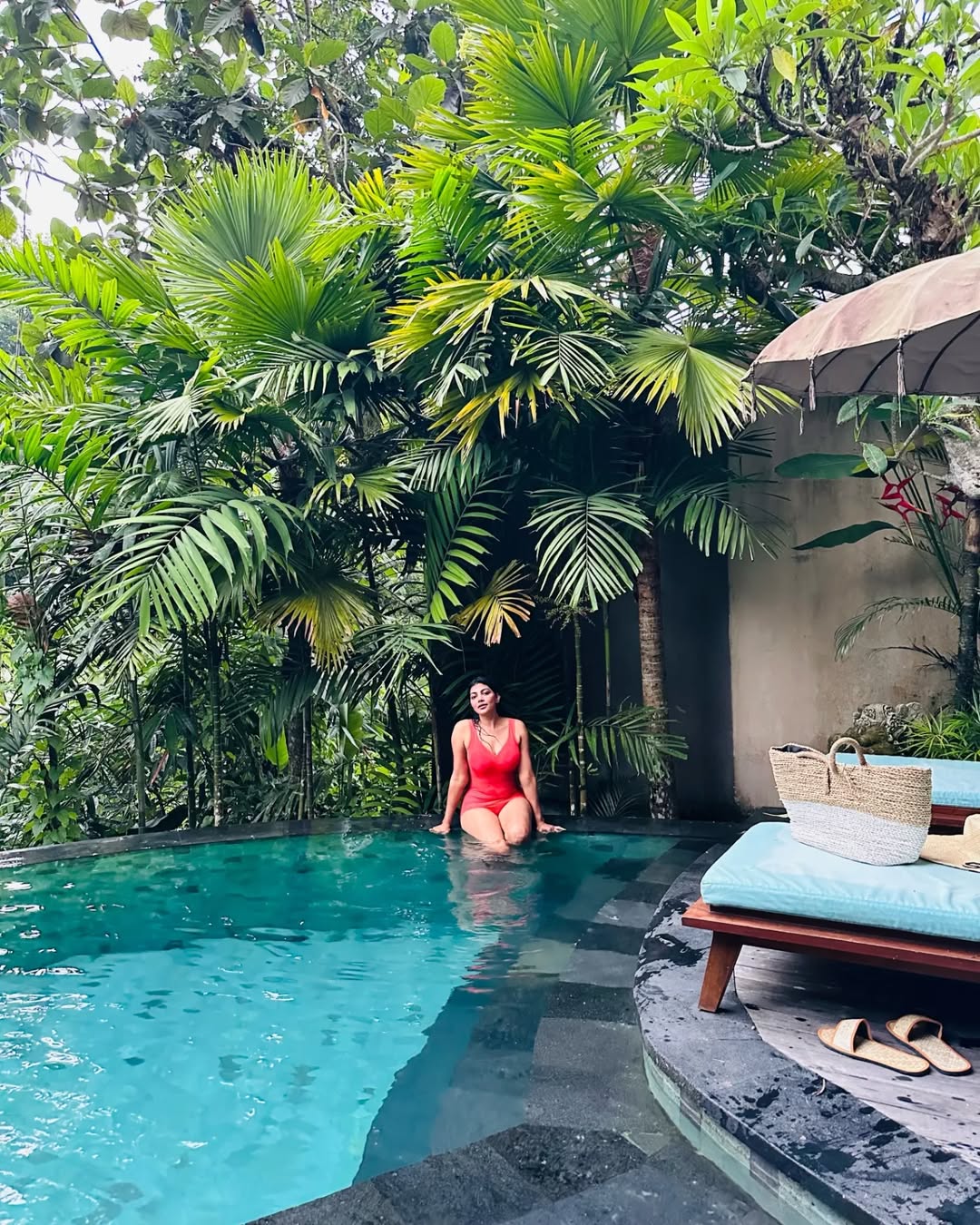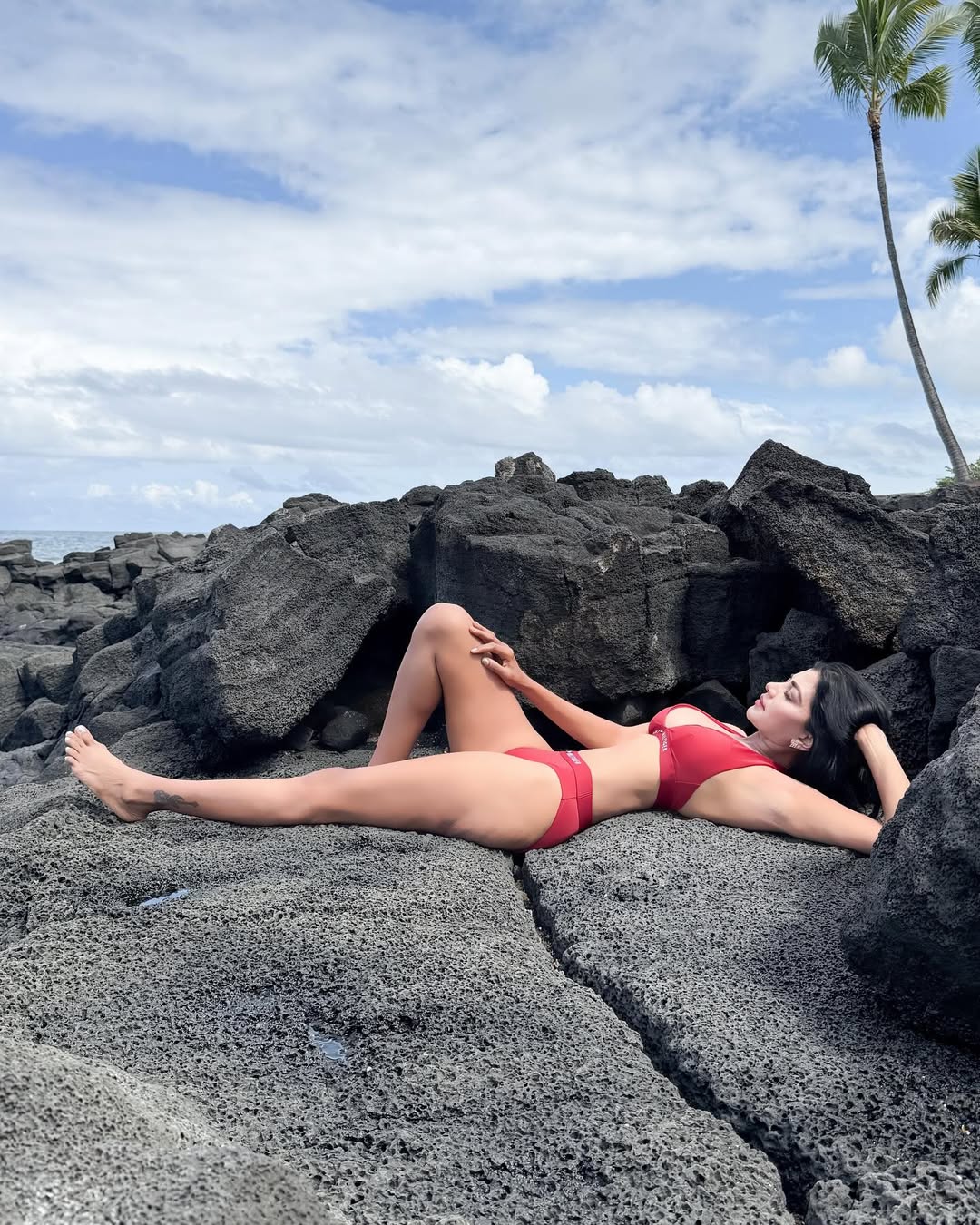 Lahari Shari recently shared a photo on Instagram capturing a moment at the beach. In the picture, she’s seen sitting on the rocks wearing a vibrant red dress, with the waves crashing behind her.