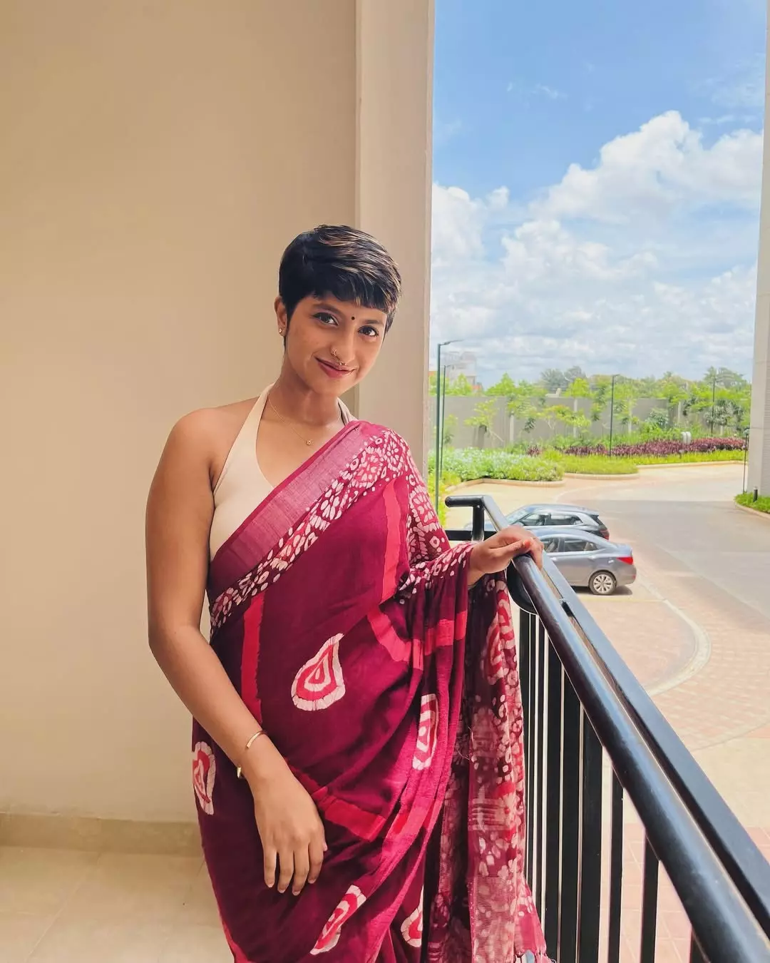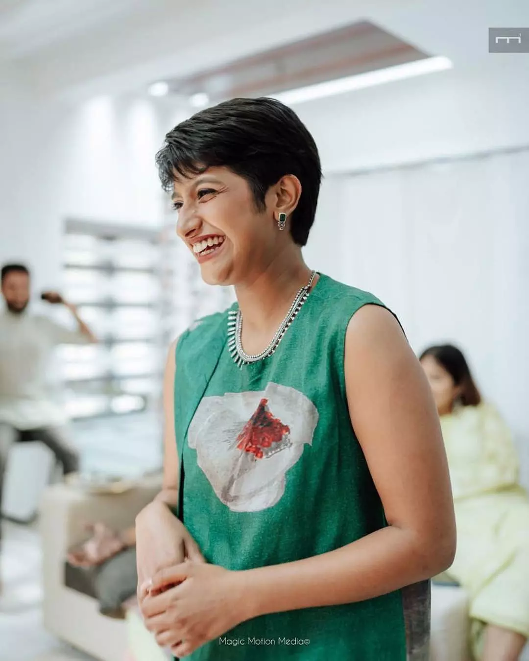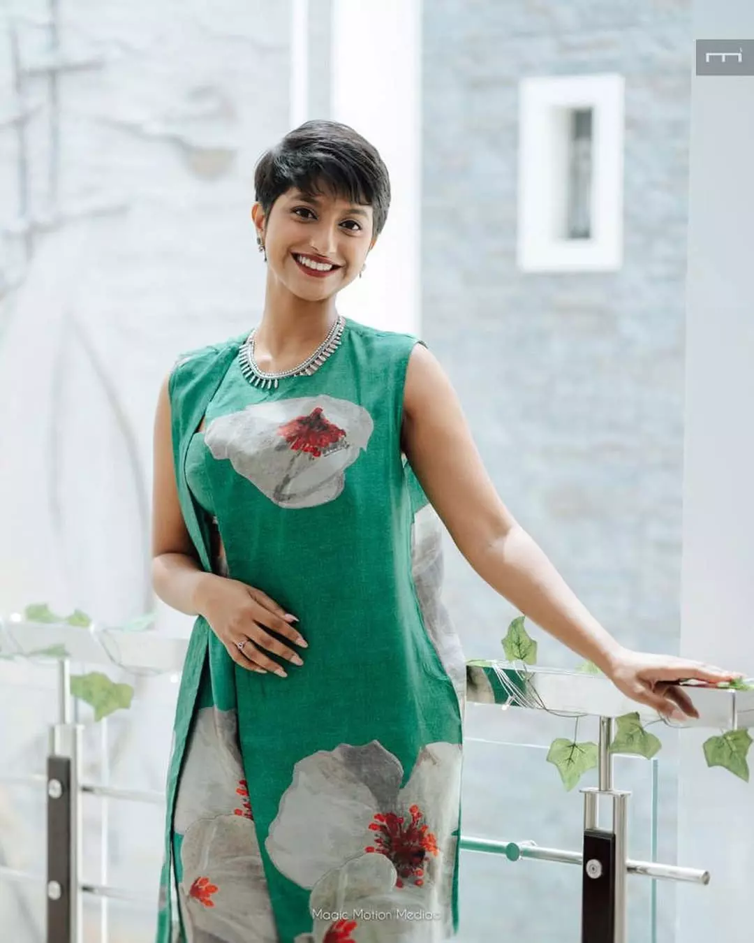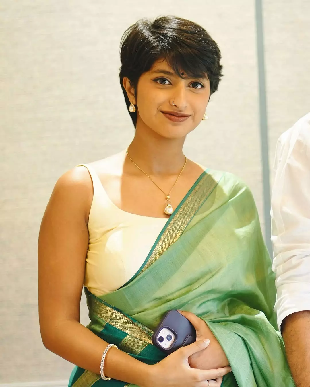 In one recent post, she wore a light green saree. She paired it with a plain cream blouse. She kept her look natural with short hair and a soft smile. She gave credits to the people behind the look. She tagged mavelitailors, saanvi_makeupartist, and mr_nidhinjoseph in her caption. She held a dark phone in her hand.