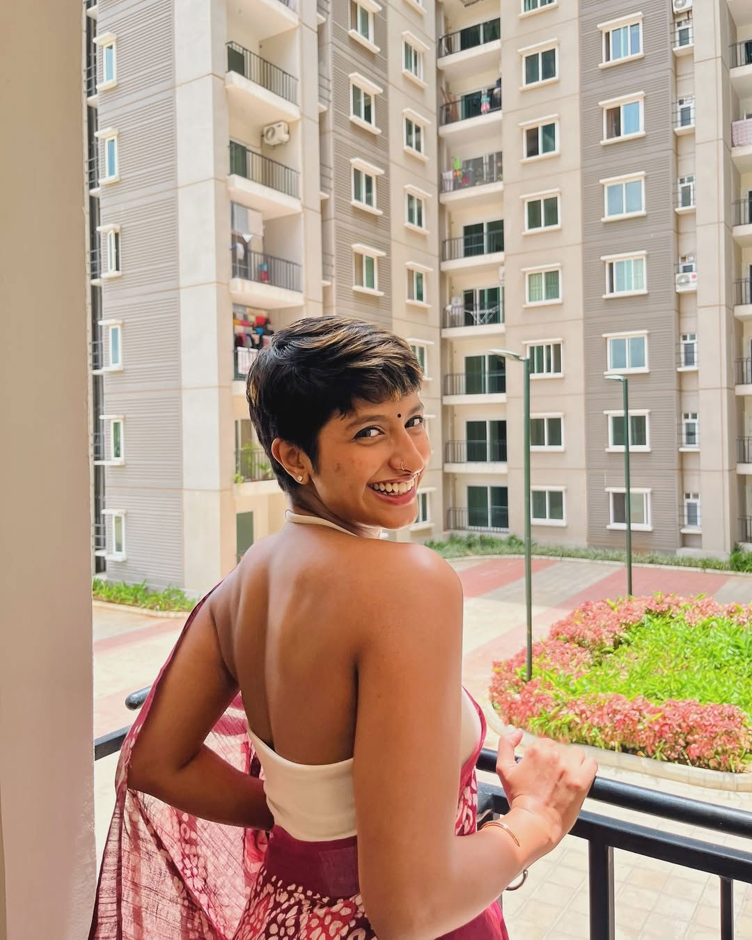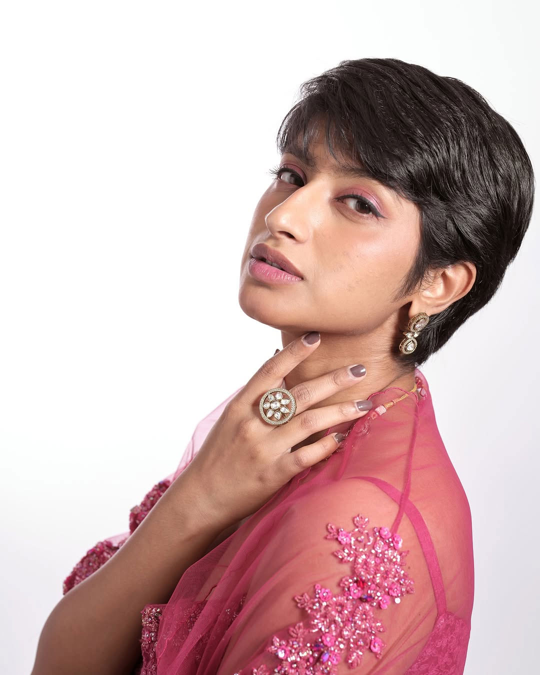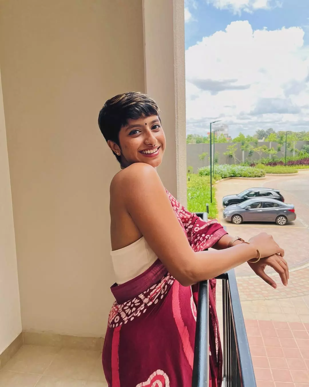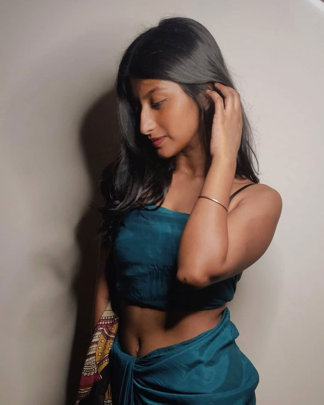 In one recent post, she wore a light green saree. She paired it with a plain cream blouse. She kept her look natural with short hair and a soft smile. She gave credits to the people behind the look. She tagged mavelitailors, saanvi_makeupartist, and mr_nidhinjoseph in her caption. She held a dark phone in her hand.