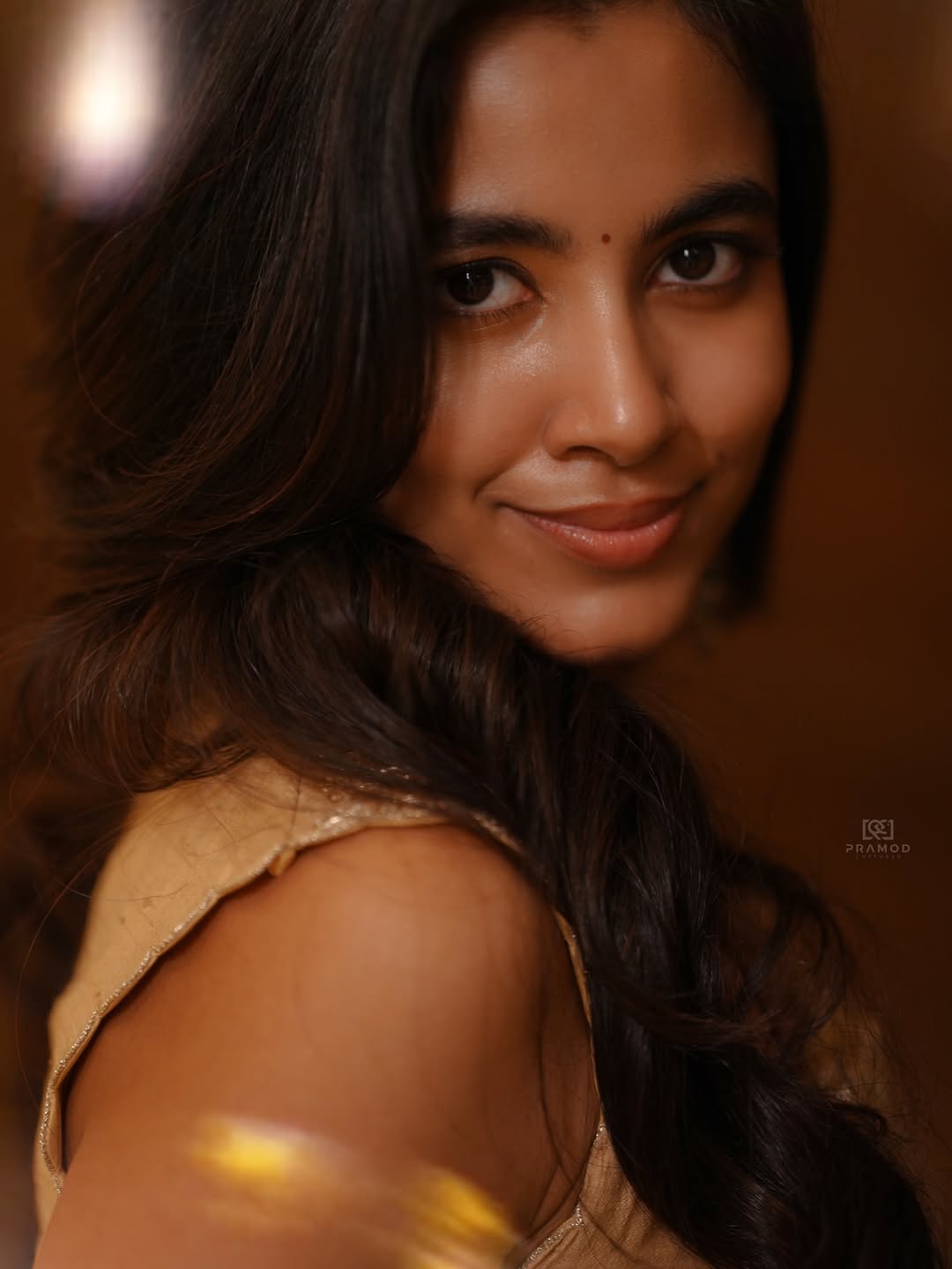 Shivani Nagaram in her latest Instagram post wore a golden dress that matched her graceful style. She leaned against a wooden wall while posing with charm. Her caption read, “Golden Girl Vibes ⭐”.