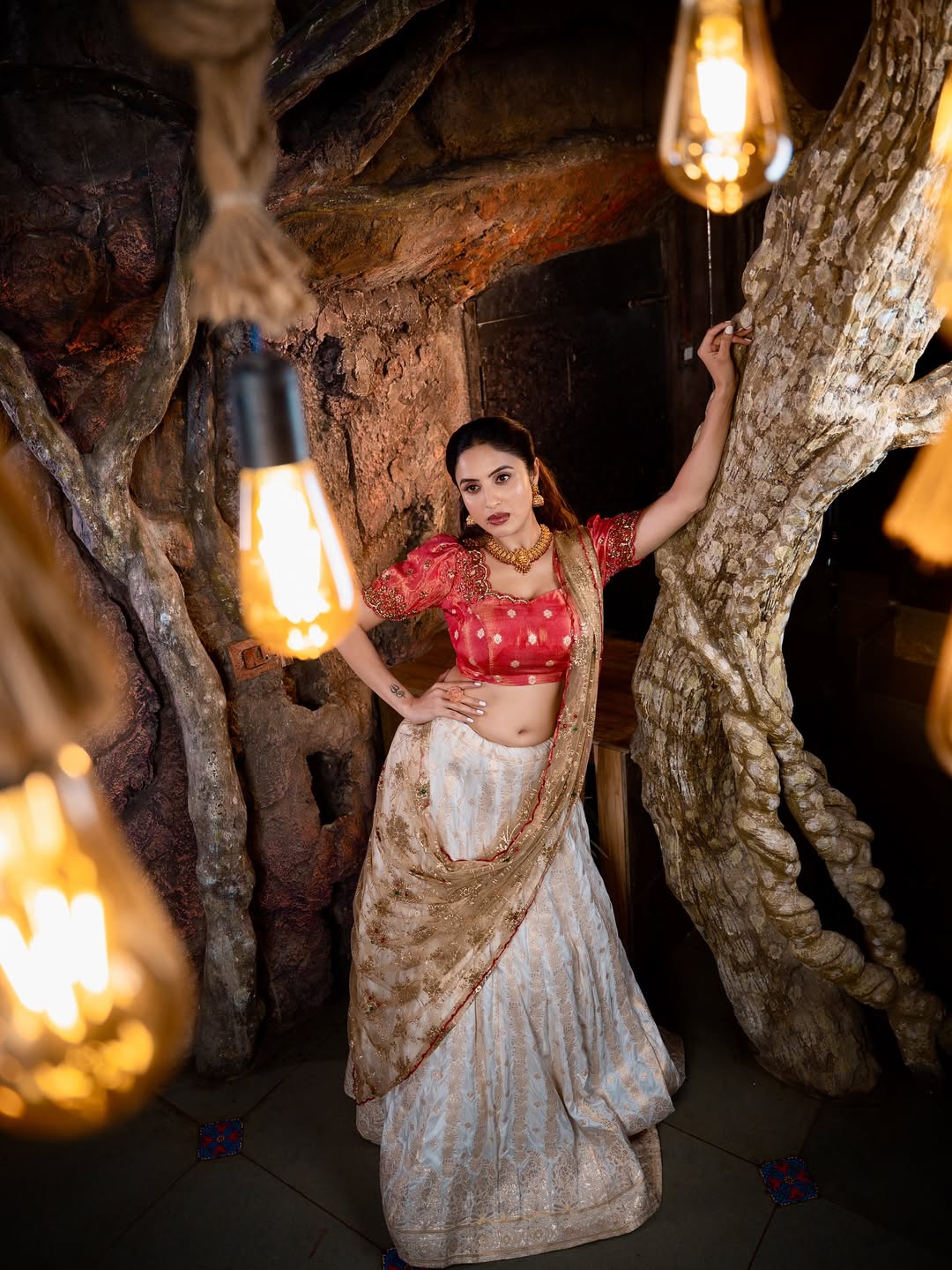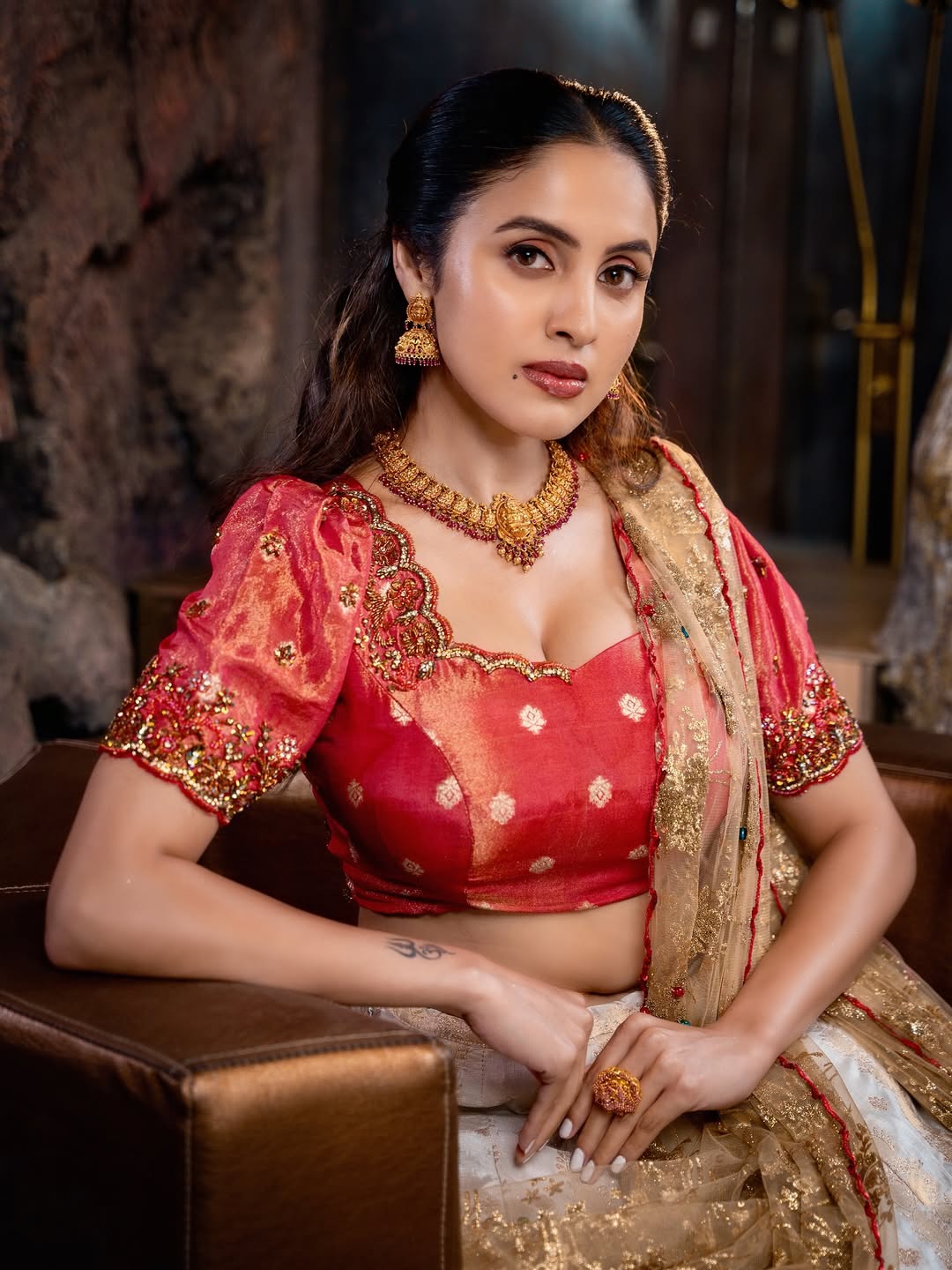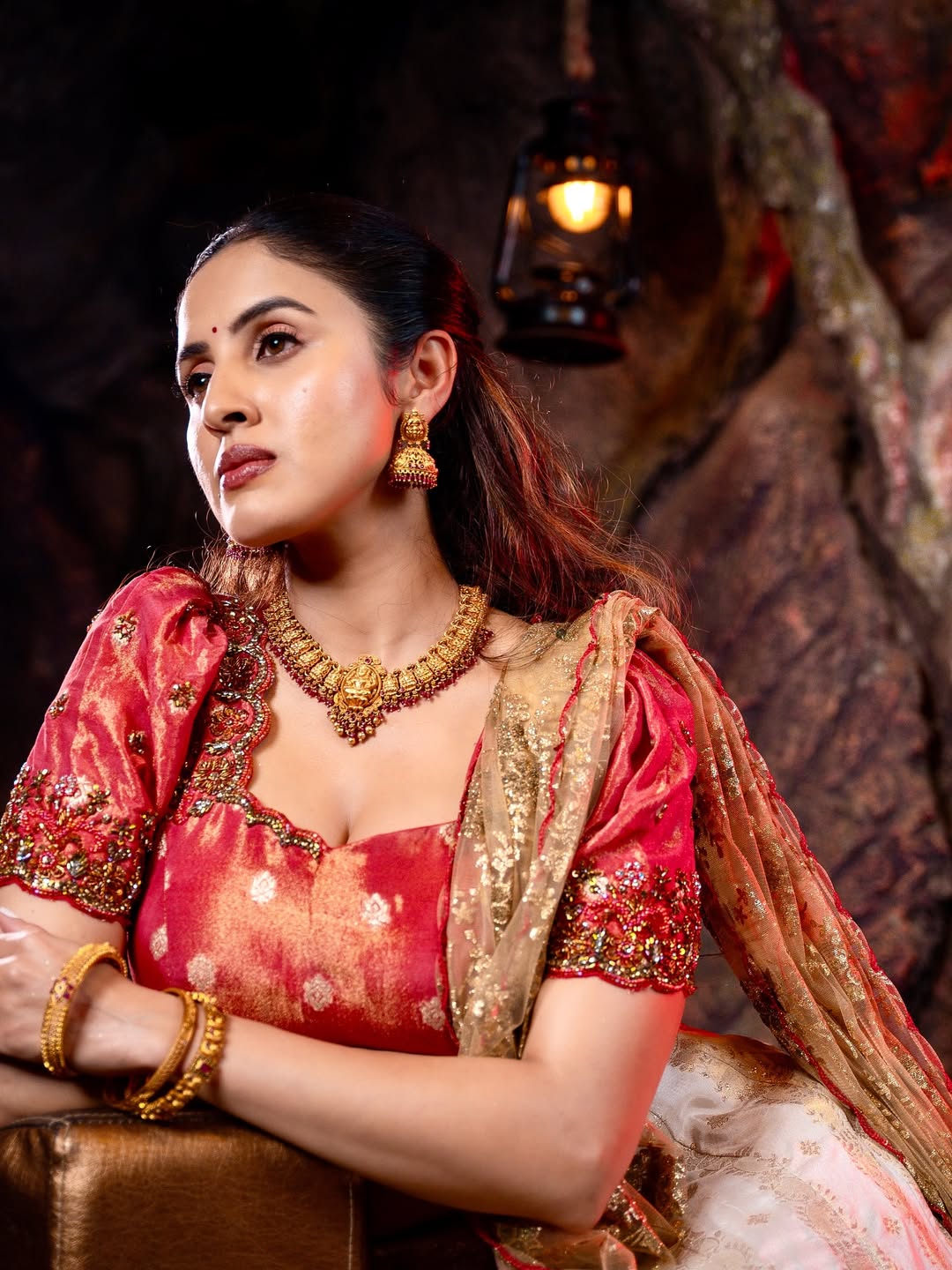 Actress Priyanka Kholgade embodies timeless grace and modern poise in her latest traditional look titled “Living in the Moment Jewel.” Draped in a stunning red and gold ensemble, she glows with elegance and sophistication. Her exquisite jewellery from @parakkat_jewels adds a royal touch, enhancing the richness of her attire with its intricate craftsmanship and regal detailing.