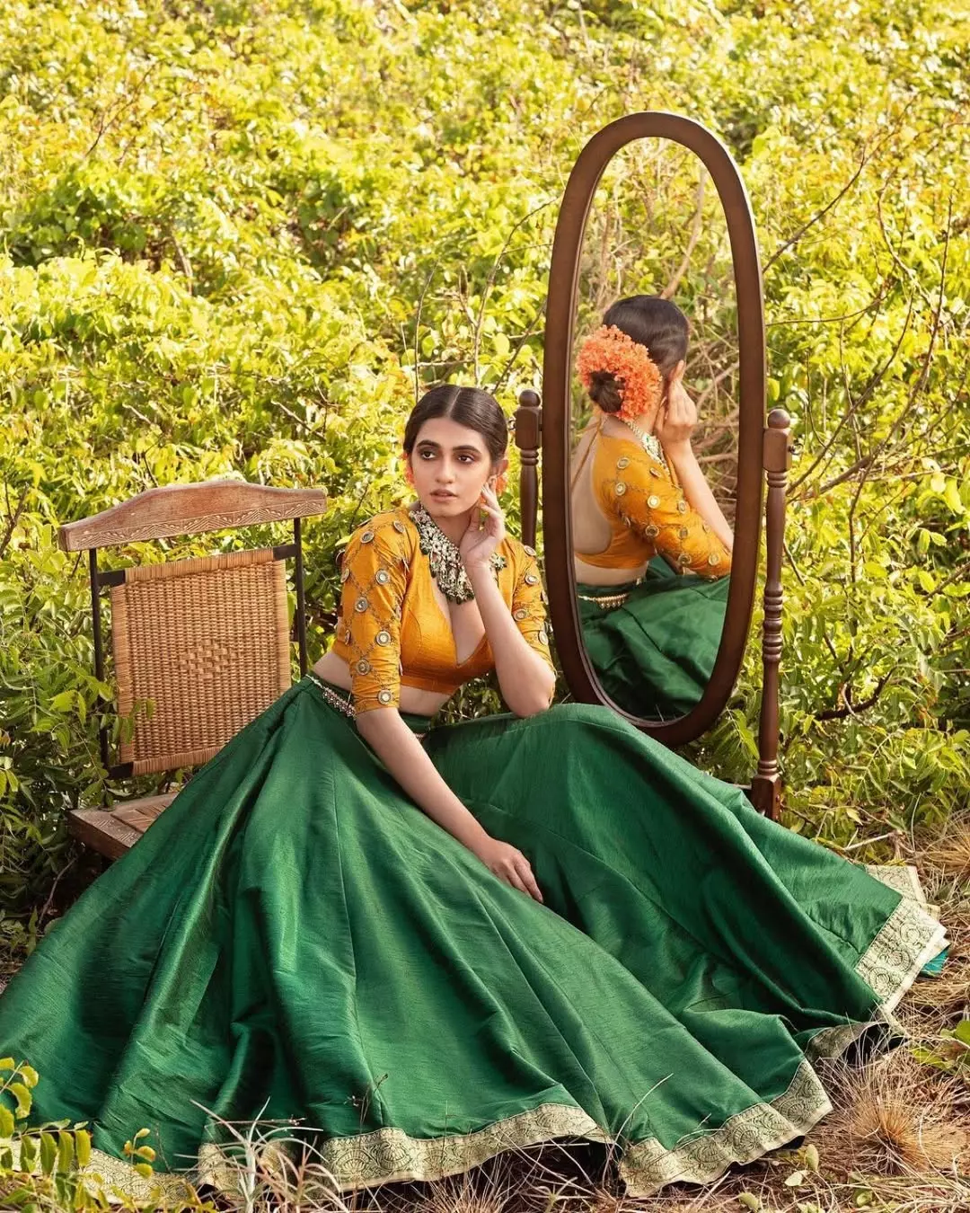 Cherukuri Maanasa Choudhary, popularly known as Maanasa Choudhary, looks graceful and elegant in a vibrant mustard-yellow and green traditional outfit with intricate silver jewellery and a bright orange flower in her hair. She poses thoughtfully beside a mirror that reflects her serene beauty amid lush greenery.
