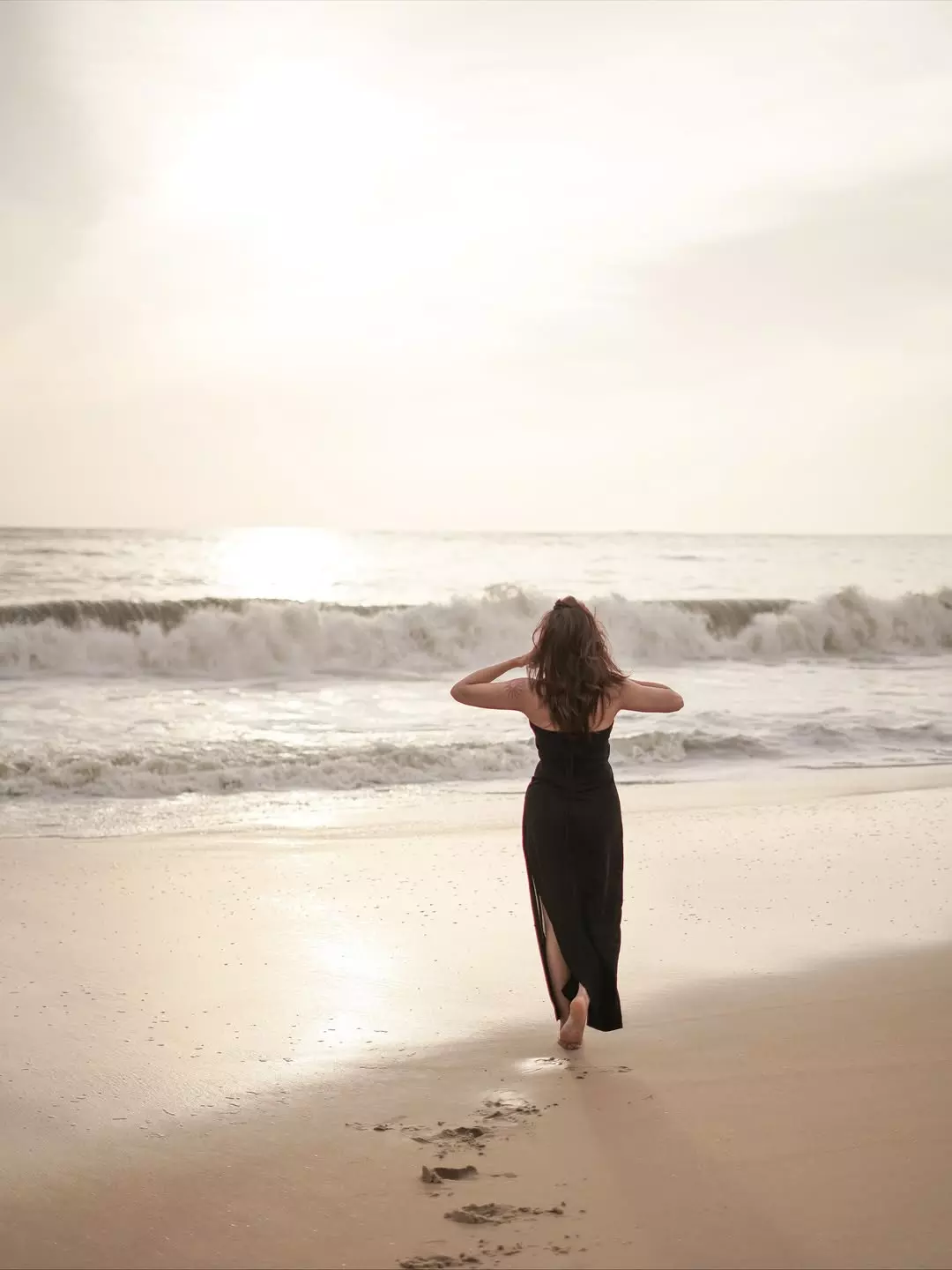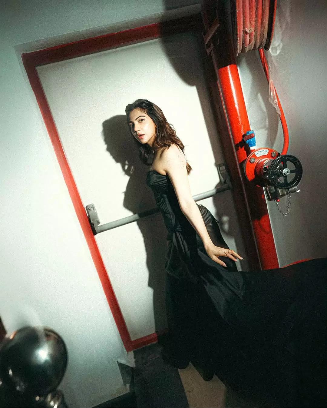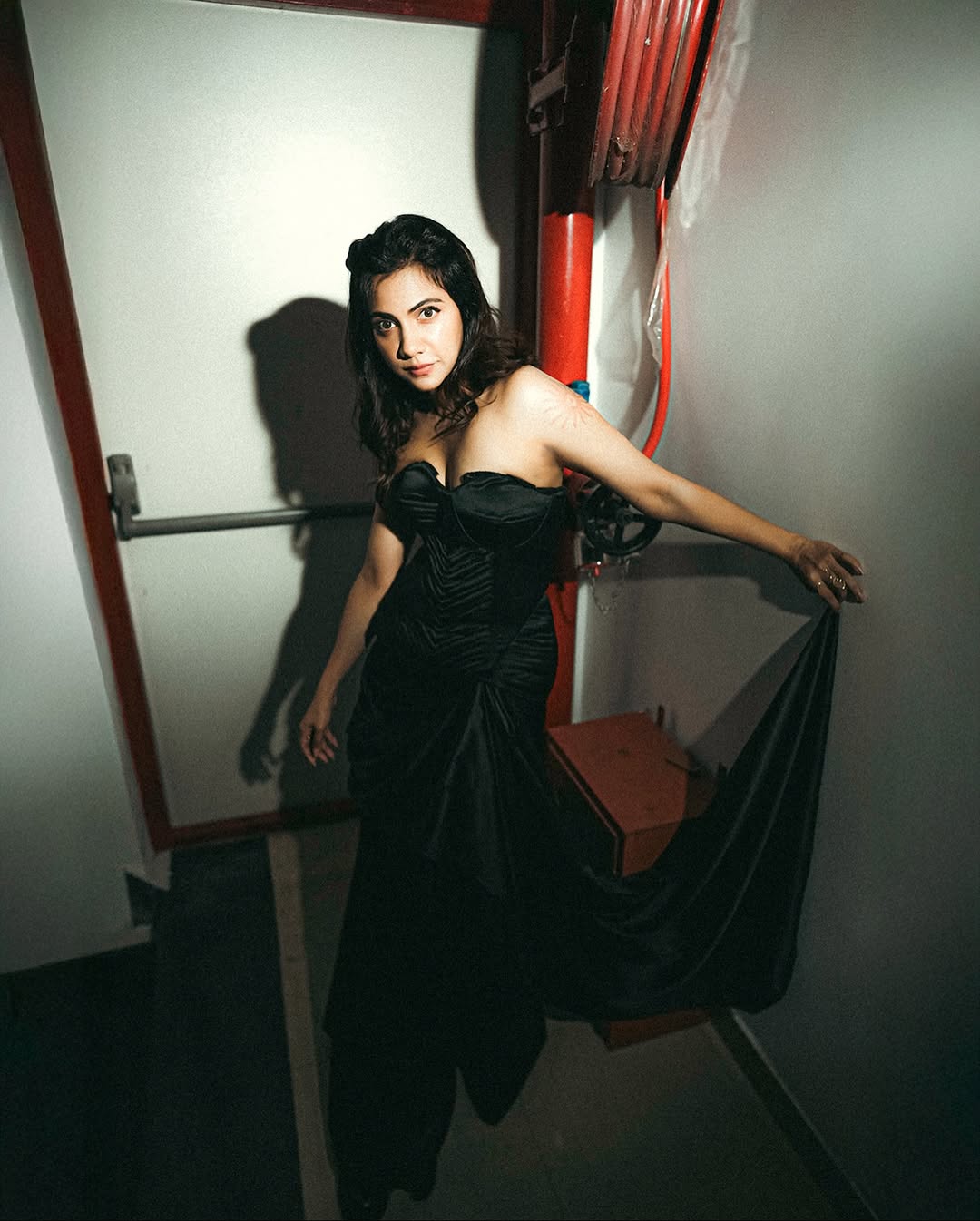 Madonna Sebastian channels midnight mystique in a sleek black satin gown that sculpts her form like liquid shadow, its ruched corset bodice flaring into a dramatic drape. Leaning against a stark wall beside a coiled red fire hose, she casts a sultry, sidelong gaze—hair tousled, lips crimson—turning an industrial corner into a high-fashion noir set. Styled by @styyledbyjoe, shot by @_harikumar_., with makeup by @jiyamakeupartistry, hair by @zintos_makeup_official, and the outfit from @vintageblossombridals, every detail smolders with deliberate allure.