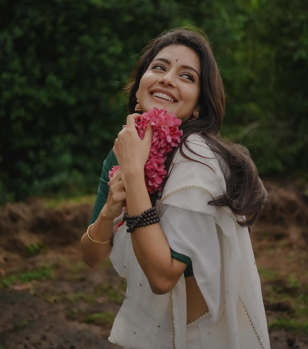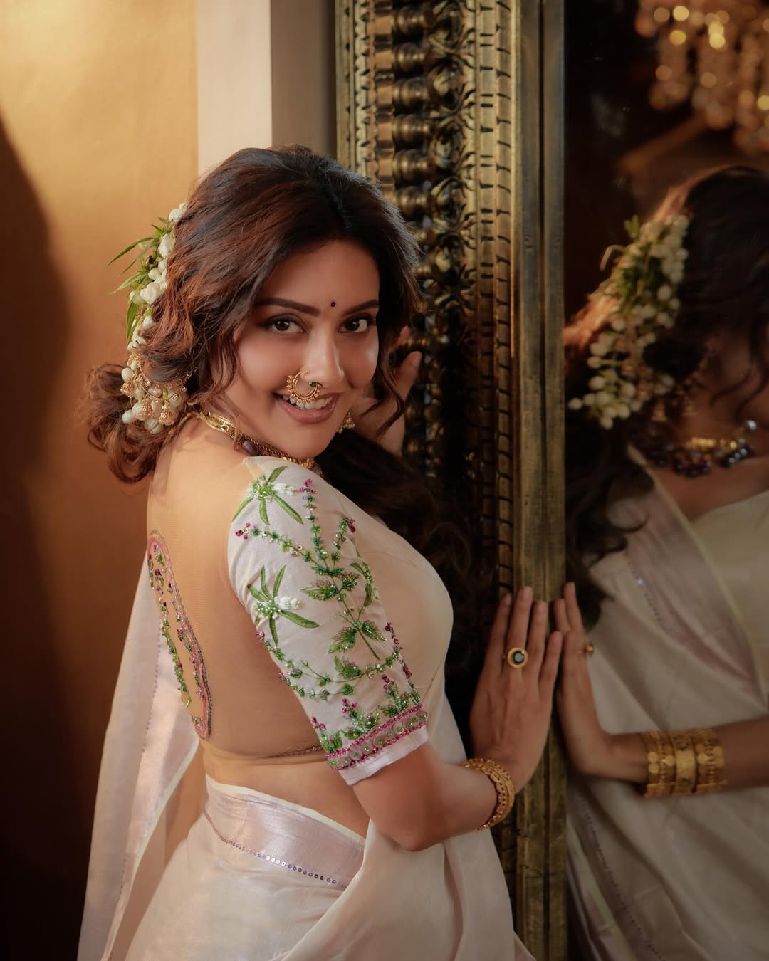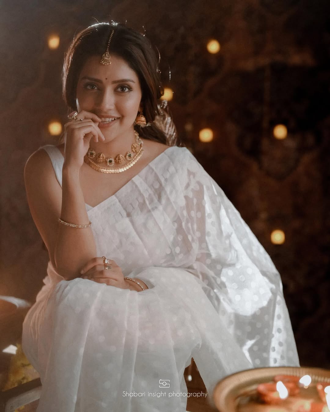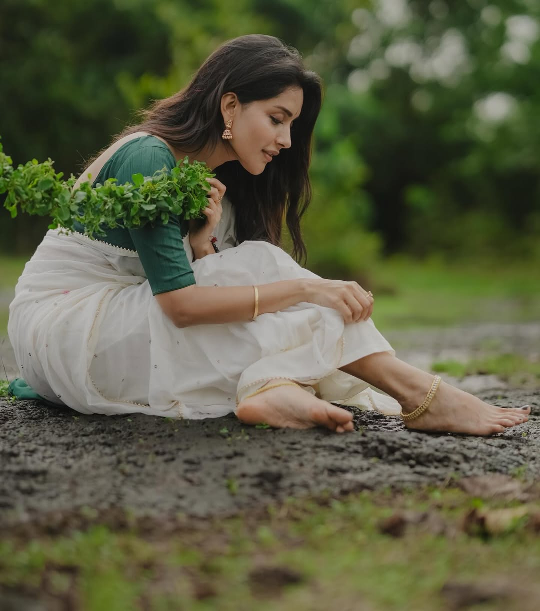 The white saree, adorned with minimal golden accents, flows beautifully, reflecting a blend of simplicity and sophistication. Mahima�s natural makeup, open wavy hair, and warm smile enhance the authenticity of the look, while her choice of delicate jhumkas completes the aesthetic with a touch of ethnic grace. Set against a lush green backdrop, this ensemble perfectly captures her radiant personality and understated elegance.