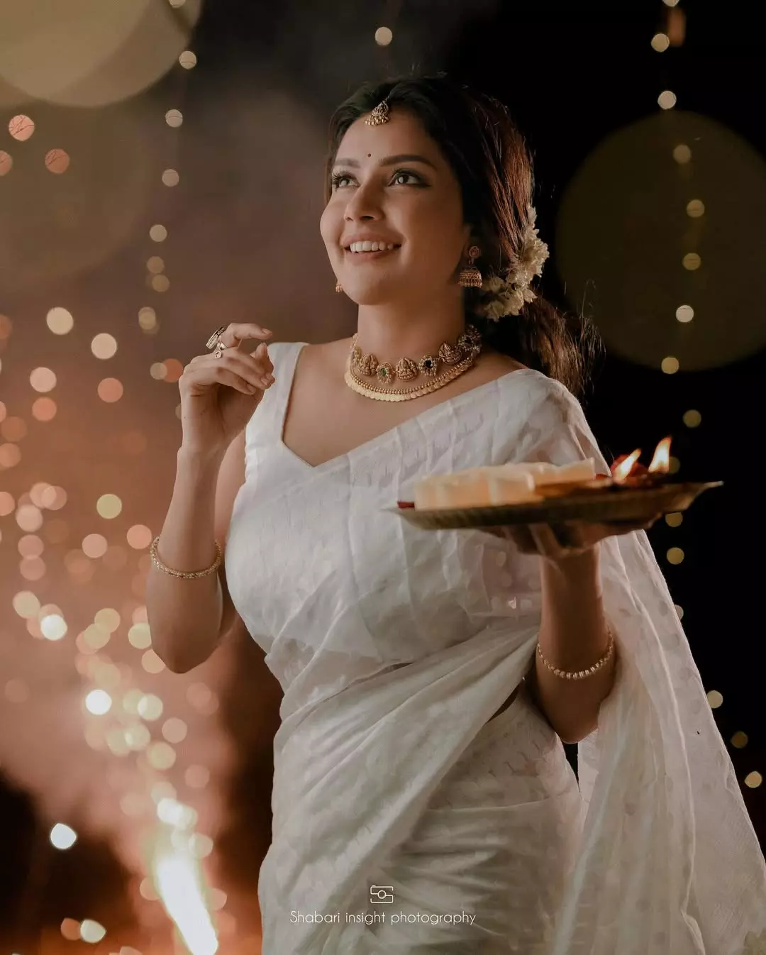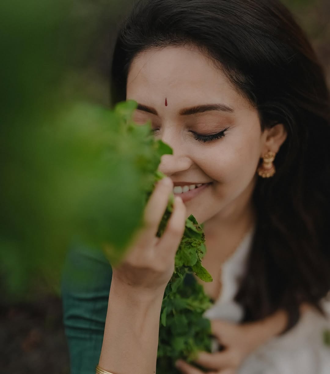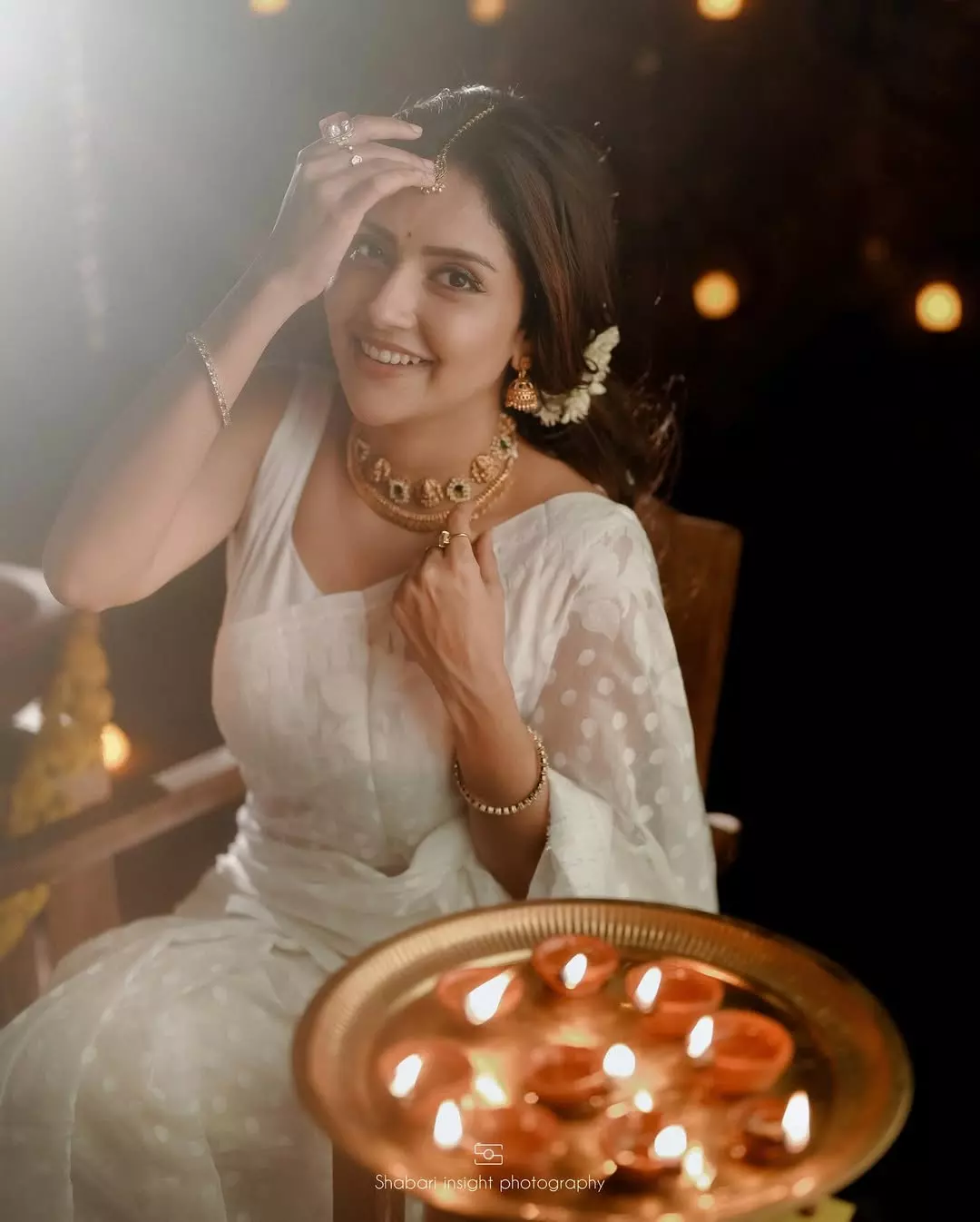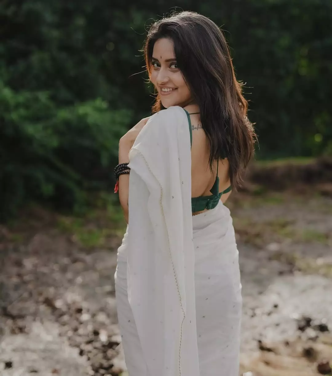 The white saree, adorned with minimal golden accents, flows beautifully, reflecting a blend of simplicity and sophistication. Mahima�s natural makeup, open wavy hair, and warm smile enhance the authenticity of the look, while her choice of delicate jhumkas completes the aesthetic with a touch of ethnic grace. Set against a lush green backdrop, this ensemble perfectly captures her radiant personality and understated elegance.