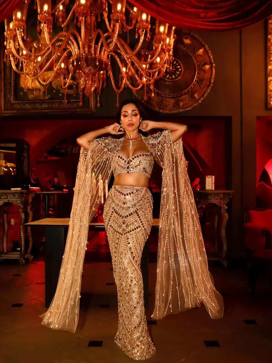 Malaika Arora turns half-century into pure sin, draped in liquid-gold Manish Malhotra INAYA couture that drips crystals and pearls like molten fire. A ruby choker plunges between mirrored sequins, cape sleeves cascading like champagne waterfalls while candlelit chandeliers bow to her glow. One hand on hip, the other flashing emerald ice—she’s proof that 50 never looked so fabulous! @malaikaaroraofficial owns timeless glamour in this sensual silhouette; poetic shoulders, pearl tears, and a bodycon that screams forever muse. True glamour never stays in the past… it keeps returning, brighter, stronger each time…