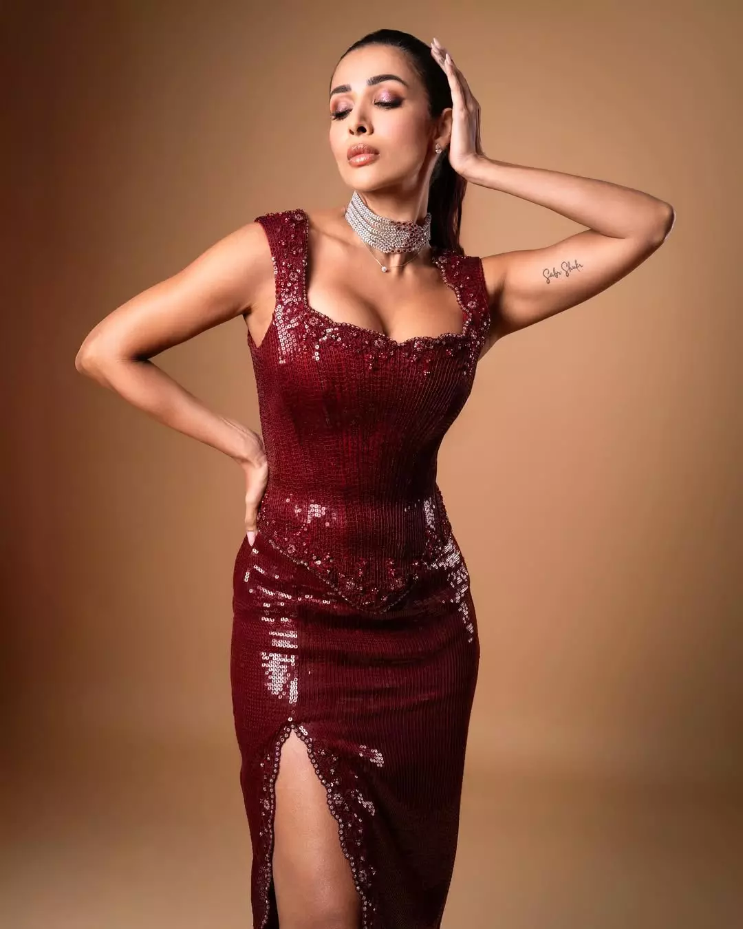 Malaika Arora scorches in sequined wine, corset bodice cinched tight while a thigh-high slit flashes toned legs like lightning.