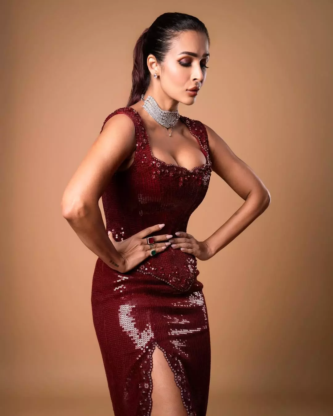 By: Tupaki Desk | 16 Nov 2025 2:15 PM ISTMalaika Arora scorches in sequined wine, corset bodice cinched tight while a thigh-high slit flashes toned legs like lightning. Diamond choker drips ice, ruby ring winks—one hand on hip, pout loaded, she’s pure red-carpet venom. #StyledByTanyaGhavri Outfit - @cliopeppiatt Neckpiece - @prerto Earring - @houseofjskjewels Rings - @houseofjskjewels @mozaati Assisted by - @priti__mehta_—the OG diva just turned a studio into her runway.