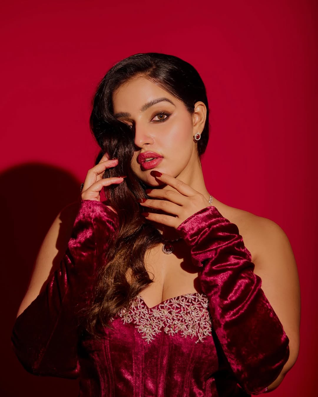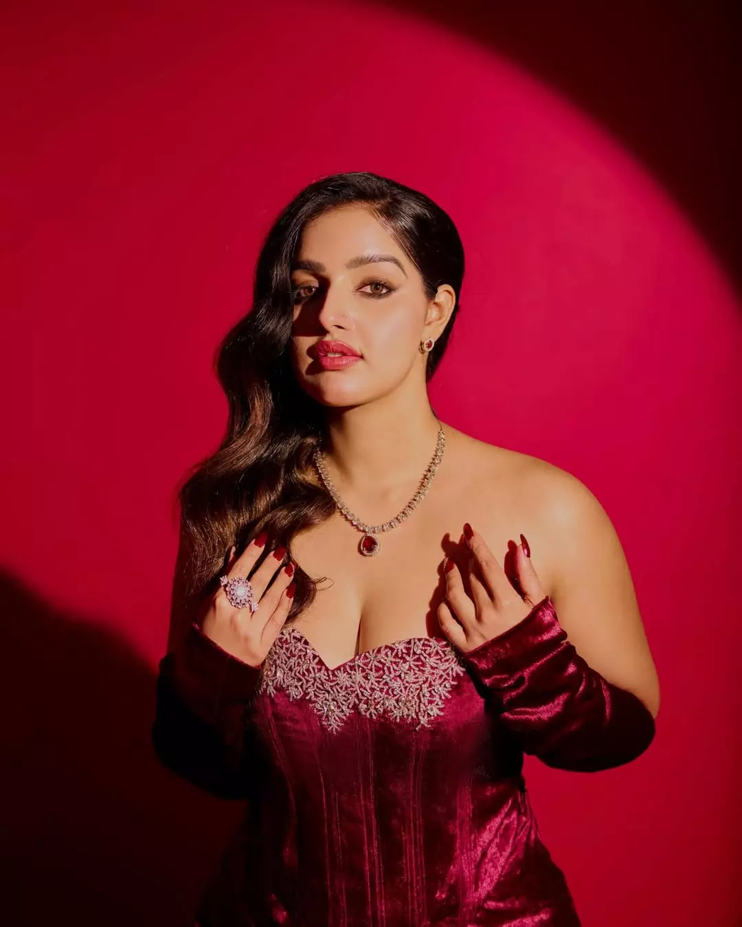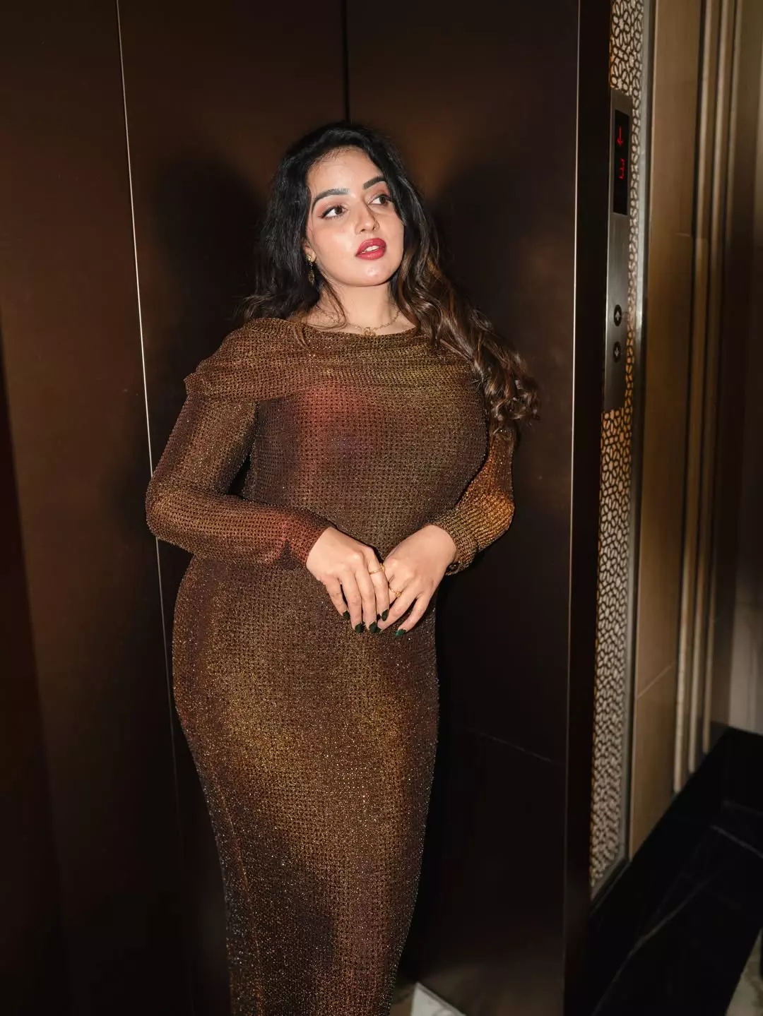 In this stunning photo, Malavika exudes warm elegance in a shimmering bronze textured bodycon gown with a round neckline and long sleeves, posing gracefully in a luxurious elevator setting. Her wavy hair, bold red lips, sultry gaze, and confident stance radiate sophistication and allure, perfectly capturing the vibe of "Hot chocolate szn alwys…". Worn @western_lady_
