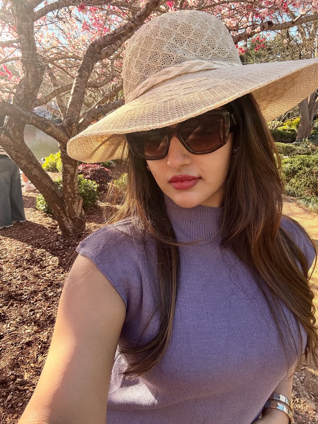 She is dressed in a soft lavender sleeveless dress and stood gracefully under the cherry blossoms by letting the sunlight touch her face. Her caption read, “The place where I am stuck — SEPTEMBER 💖🎀✨❤️ Heart says am still SEPTEMBERING….”