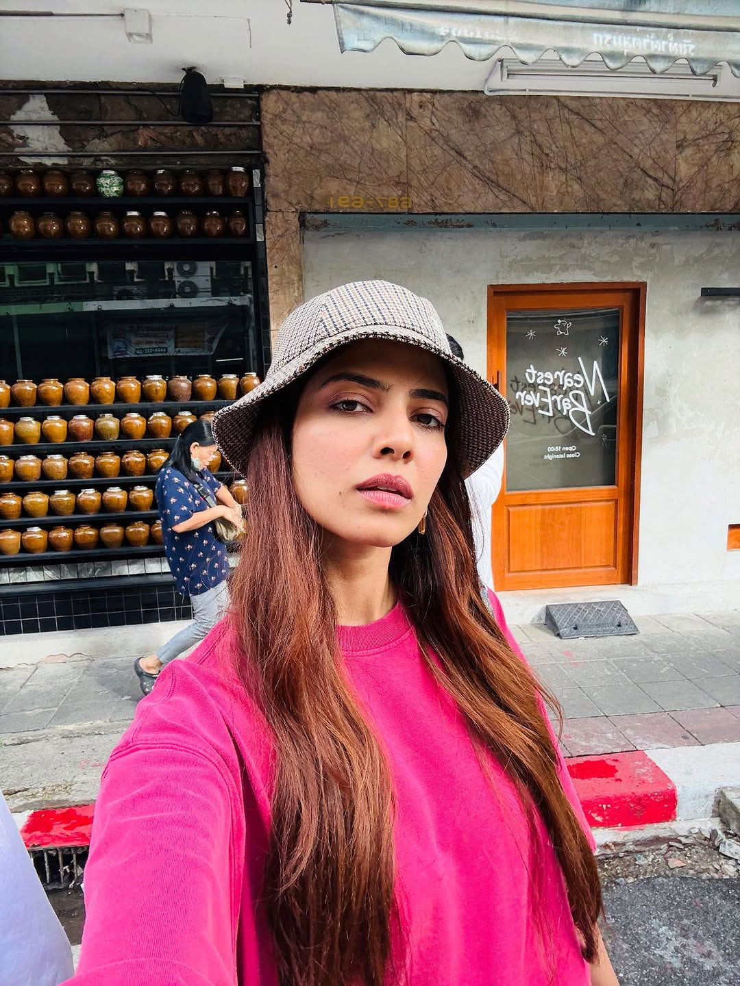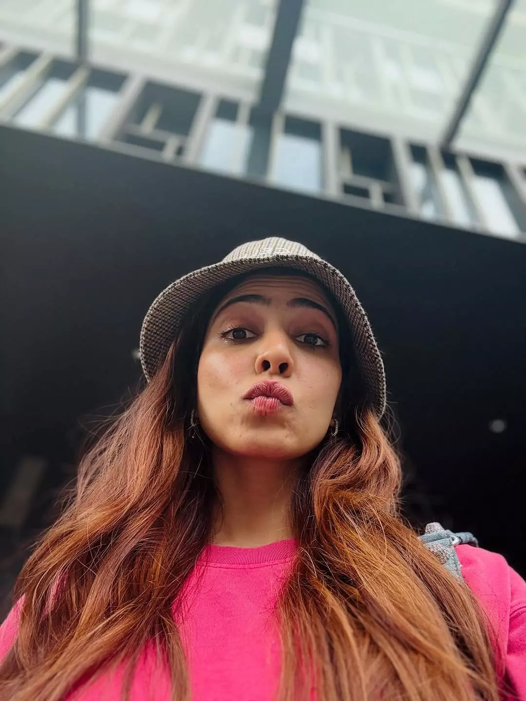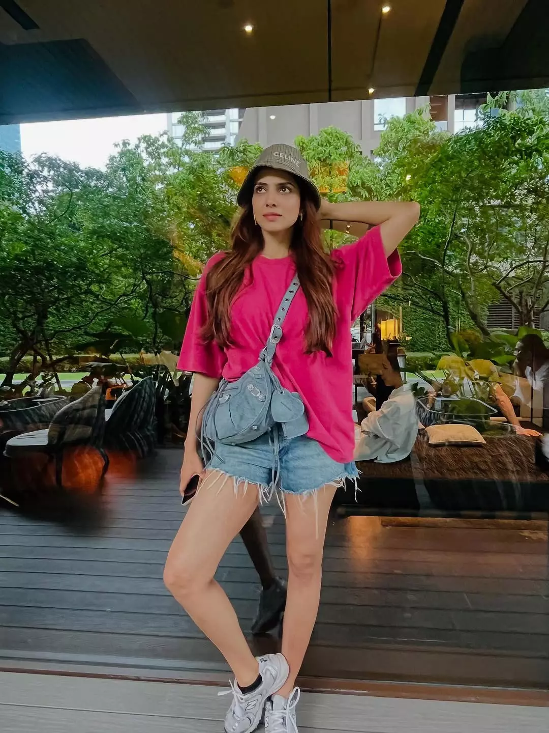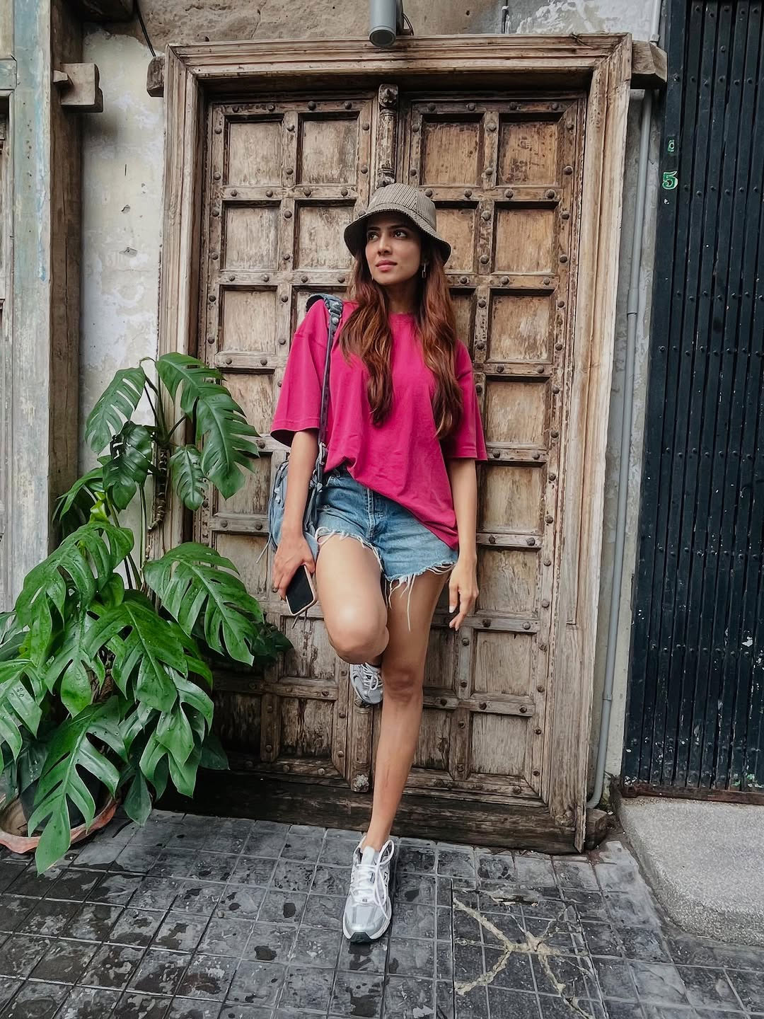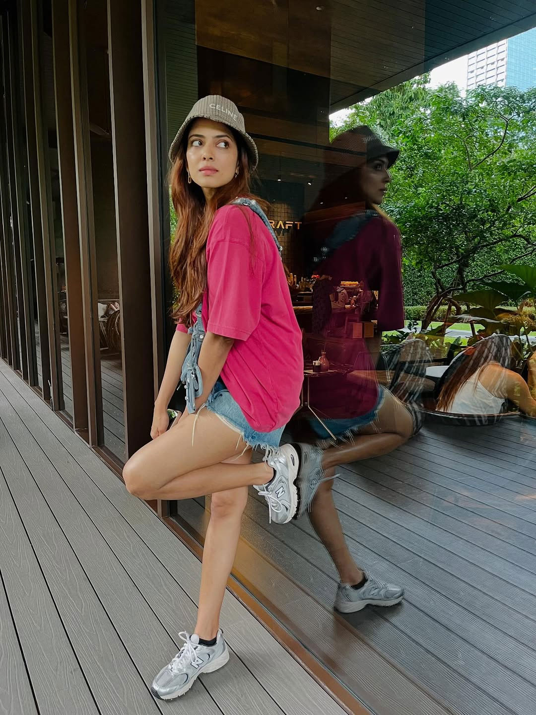 In the picture, Malavika is seen casually standing in front of a wall filled with fun stickers giving off a lively and carefree vibe. She’s wearing a loose pink top with denim shorts and sneakers paired with a crossbody sling and a bucket hat.