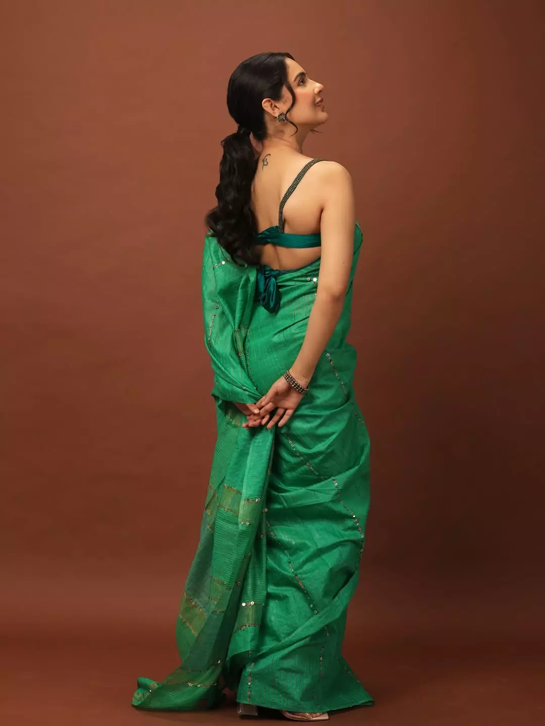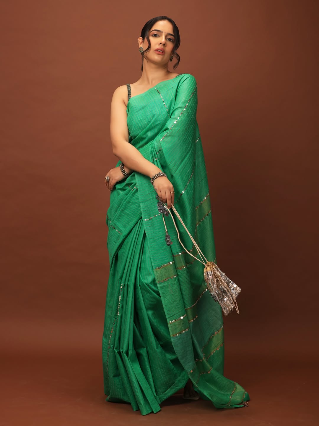 Actress Malvi Malhotra recently shared a graceful moment from the promotions of her upcoming film Jenma Natchathiram. In the Instagram post, she appeared in a lovely green saree paired with classic accessories and a silver potli bag. She mentioned that the saree was by Von India, makeup by Drushty from Makeovers by Drushty and her hairstyle was done by Team Shazz. The photo credits go to Varuun.jpg and her overall styling was handled by Style Deintrepide with jewelry provided by Pitara Accessories. Her caption read: “For Jenma Natchathiram Promotions #Dogshow 💚”