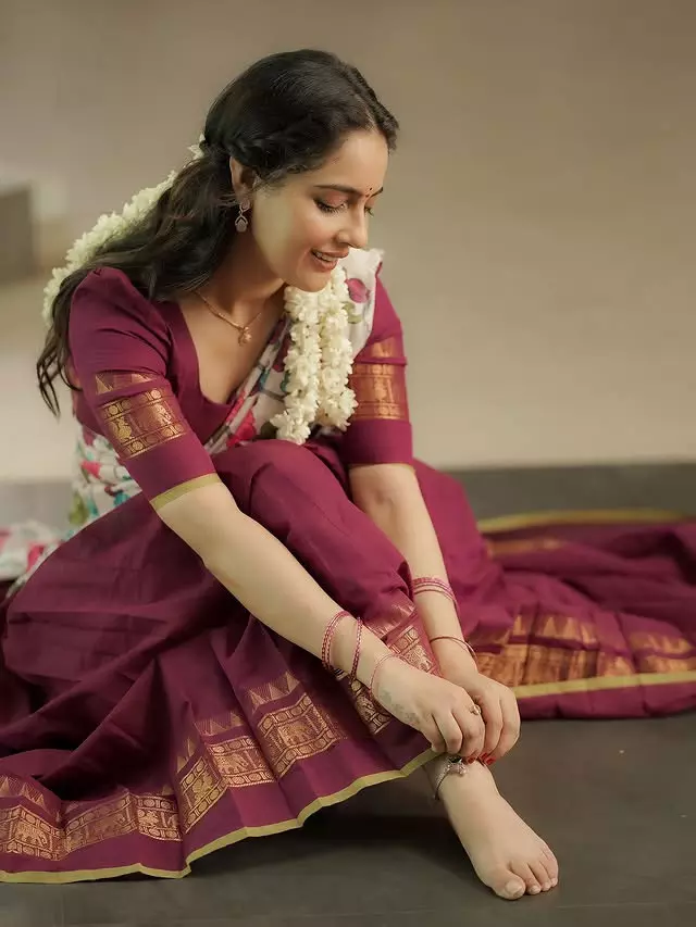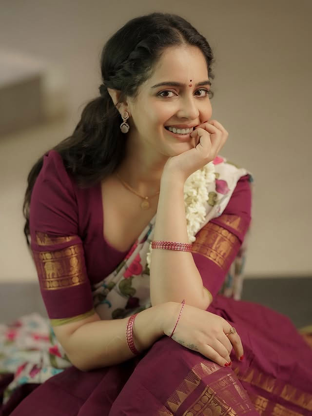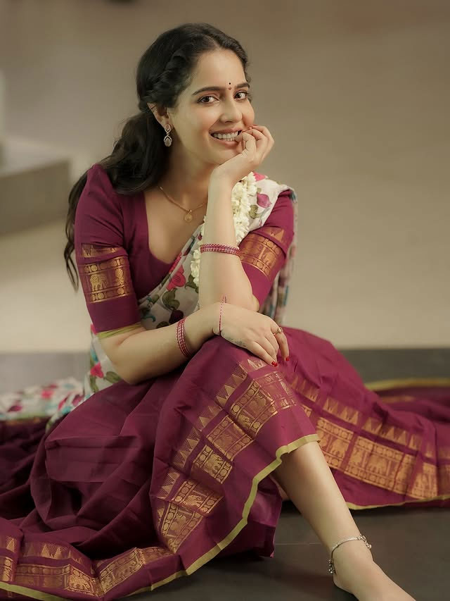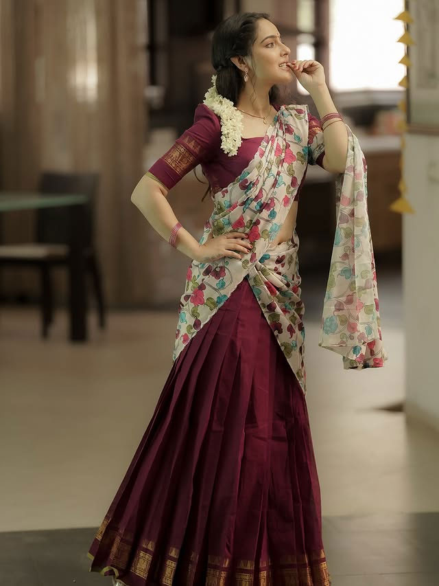 Malvi Malhotra recently shared a charming photo on Instagram that brought smiles to her fans. Dressed in a traditional maroon half saree with golden borders and floral patterns, she looked calm and joyful. Her warm expression and soft smile lit up the frame, making it hard to scroll past. In her caption, she simply asked, “Eppadi Irukanga?” (How are you all?)